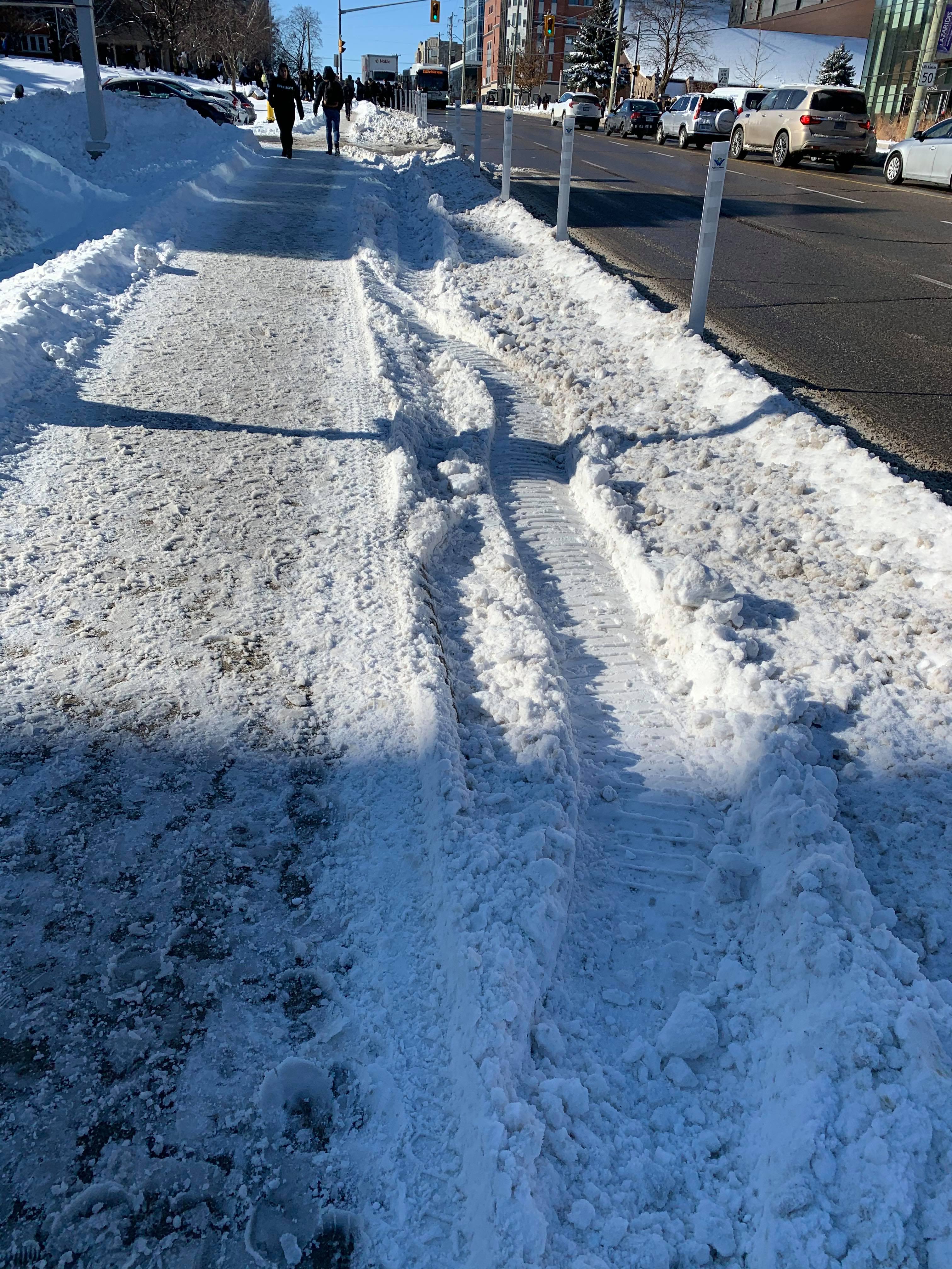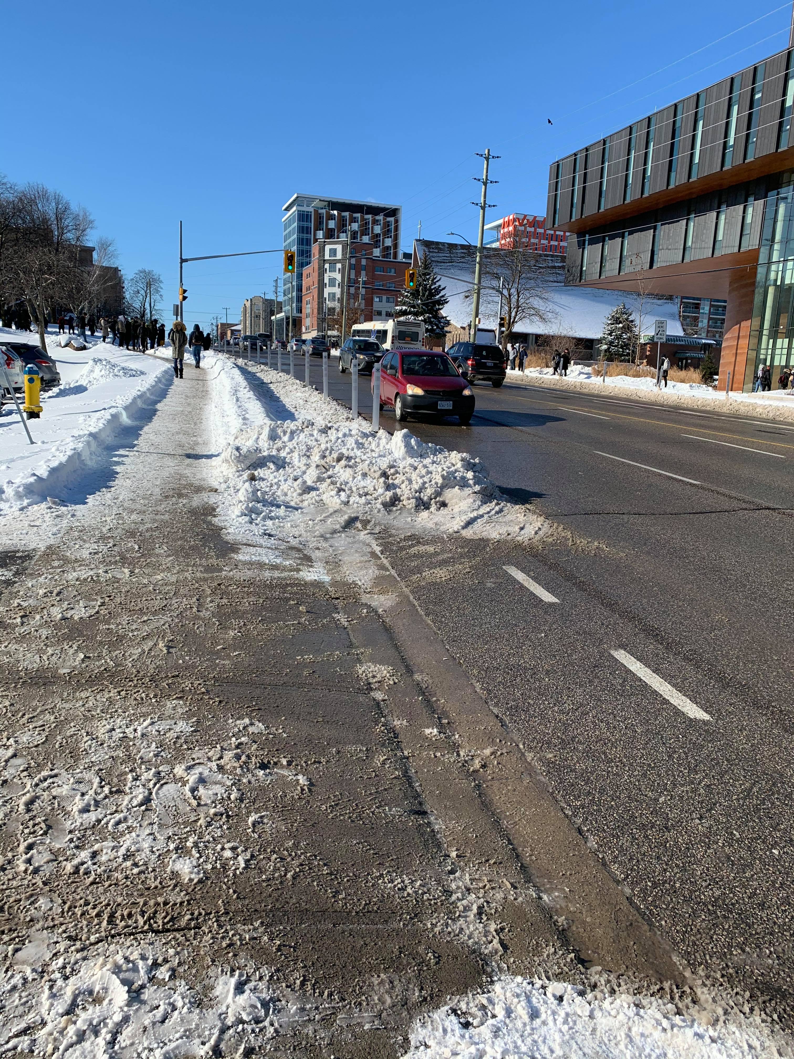 RE: Cycling in Waterloo Region - eh-cun71 - 01-21-2020 The promised snow clearing of the separated bike lane pilot is going well. Taken around 11am yesterday on University - 2 days after the big snowfall. I've heard it's been cleared today so I'm going to try and take the bike out today. RE: Cycling in Waterloo Region - timc - 01-21-2020 The Columbia bike lane wasn't cleared when I was driving this morning. RE: Cycling in Waterloo Region - panamaniac - 01-21-2020 What kind of equipment do they use to clear those lanes? RE: Cycling in Waterloo Region - jeffster - 01-21-2020 (01-21-2020, 11:44 AM)panamaniac Wrote: What kind of equipment do they use to clear those lanes? Could be a zero turn Toro with a shovel at the front, or one of those small articulated vehicles. RE: Cycling in Waterloo Region - eh-cun71 - 01-21-2020 I saw one clearing king st southbound. I would describe it as an industrial snowblower with a driver's cab on the back. The spout is very tall. It was spraying the snow over the sidewalks and onto the adjacent properties/lawns, not just to the side of the bike lane. RE: Cycling in Waterloo Region - jwilliamson - 01-21-2020 The lane on Erb St. was cleared today, except they didn't bother to clear the connection to the sidewalk at Caroline so counter-flow cyclists had to either ride the wrong way in the traffic lane or dismount and carry their bike through the snow. RE: Cycling in Waterloo Region - robdrimmie - 01-22-2020 Neither side of the brand new bike lanes on Ottawa between Homer Watson and Mill were plowed this morning. RE: Cycling in Waterloo Region - Coke6pk - 01-22-2020 Not sure what the issue is.... look's perfectly cleared for bikes.... Coke RE: Cycling in Waterloo Region - Bob_McBob - 02-01-2020 A Cambridge cyclist was struck and killed by an impaired driver last night. https://kitchener.ctvnews.ca/fatal-collision-between-bicycle-and-vehicle-leads-to-impaired-charges-1.4793398 RE: Cycling in Waterloo Region - Bytor - 02-02-2020 (02-01-2020, 01:19 PM)Bob_McBob Wrote: A Cambridge cyclist was struck and killed by an impaired driver last night. And the ever assinine Waterlo Regional Record uses a grammatical format that lays the blame on the cyclist: https://twitter.com/mikeboos/status/1223679500036296704