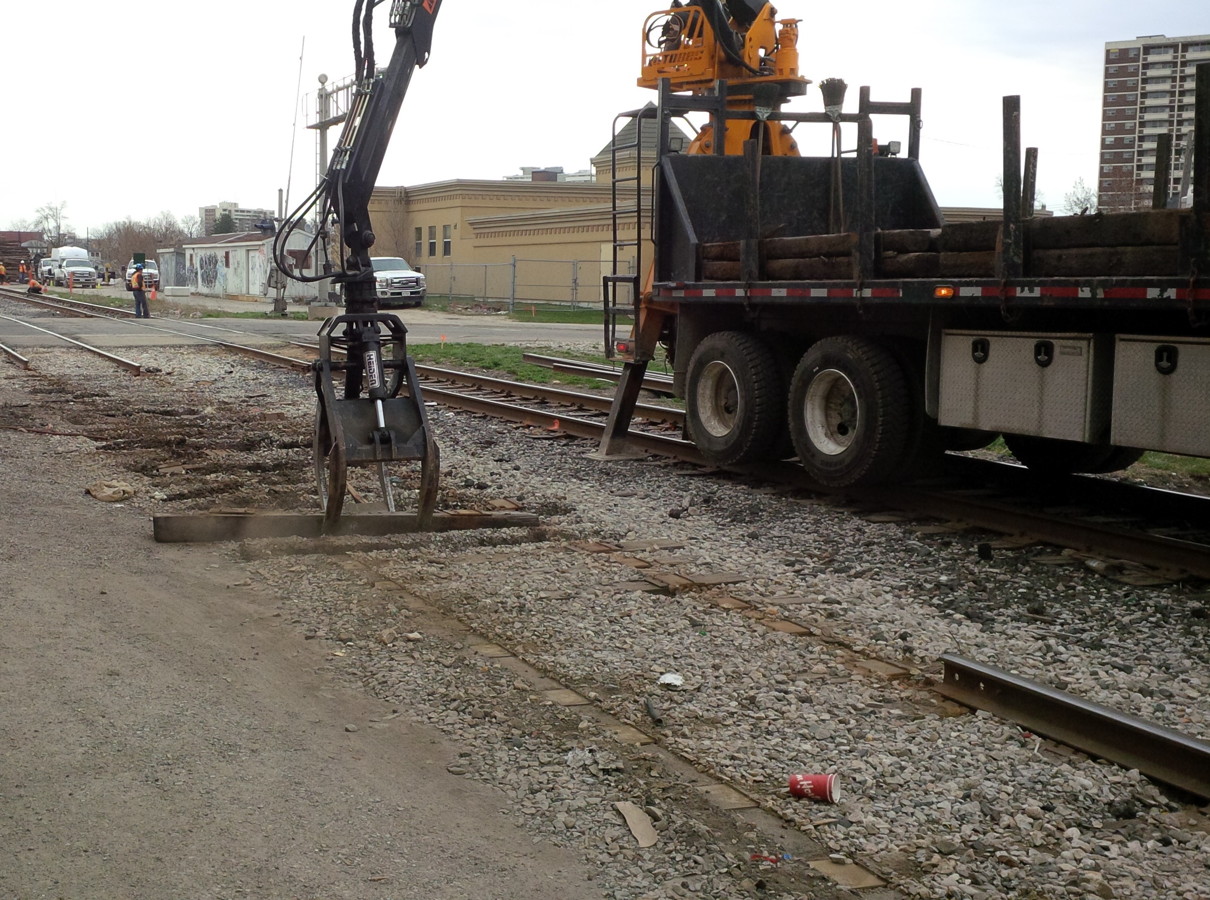 This morning they were ripping up the North CN track just east of Duke. They have an interesting rail-bound truck for pulling ties out of the ballast. Pretty mesmerizing to watch, actually.