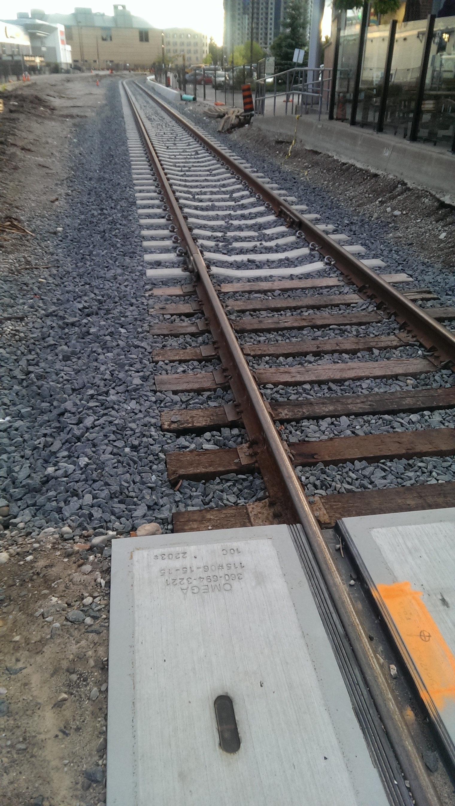 That moment where concrete ties become wooden. I mean, I guess it had to happen somewhere. I still find it strange they end up using both. This is looking across King towards the passage that lets trains continue down the spur line. I recall at the Spur Line Trail meeting, the city indicating their hopes that the rail line would be shifted slightly north (left in this picture) to allow the trail to continue through here. The picture shows that there is indeed space (just barely), and you can see the tracks shift to the north side at the end of the passage, but are towards the middle in the foreground where they enter the passage. Seems unnecessary to have them positioned there, I suppose they could still move, but it doesn't look like they will. I am not surprised about this, given that the city is twice removed from those actually doing the work. I did express my frustration at the idea in the original meeting. I felt that even if the rails could be moved, the trail would be tight through there. I felt that the "temporary" (now looking less temporary) "routing" of the trail down Regina and onto Willis Way should be considered permanent and room in the budget should be made to implement a proper trail connection that people would actually feel safe using. I didn't think they should count on being able to actually move the freight alignment, although I suppose we still have some time to go on this.