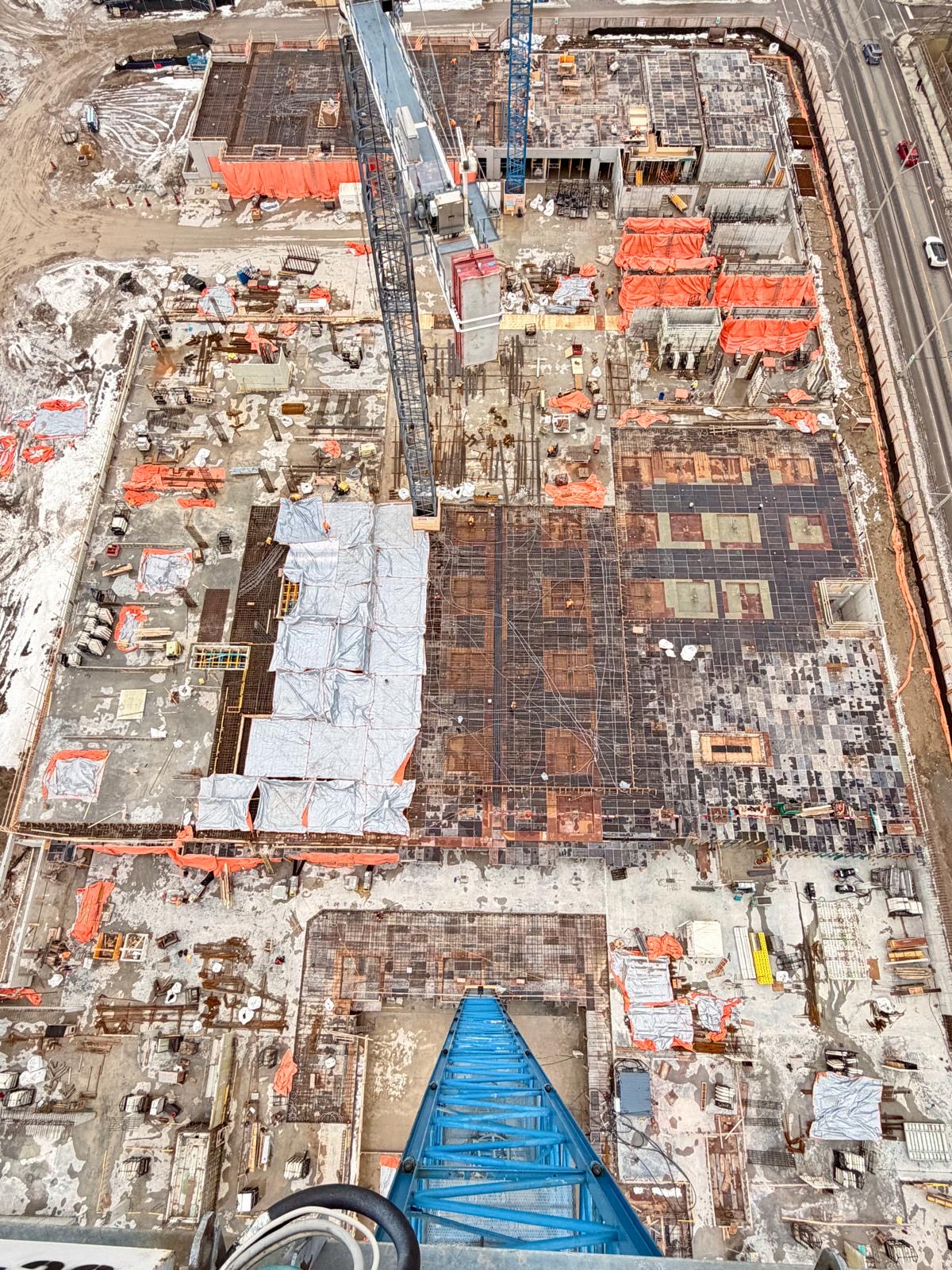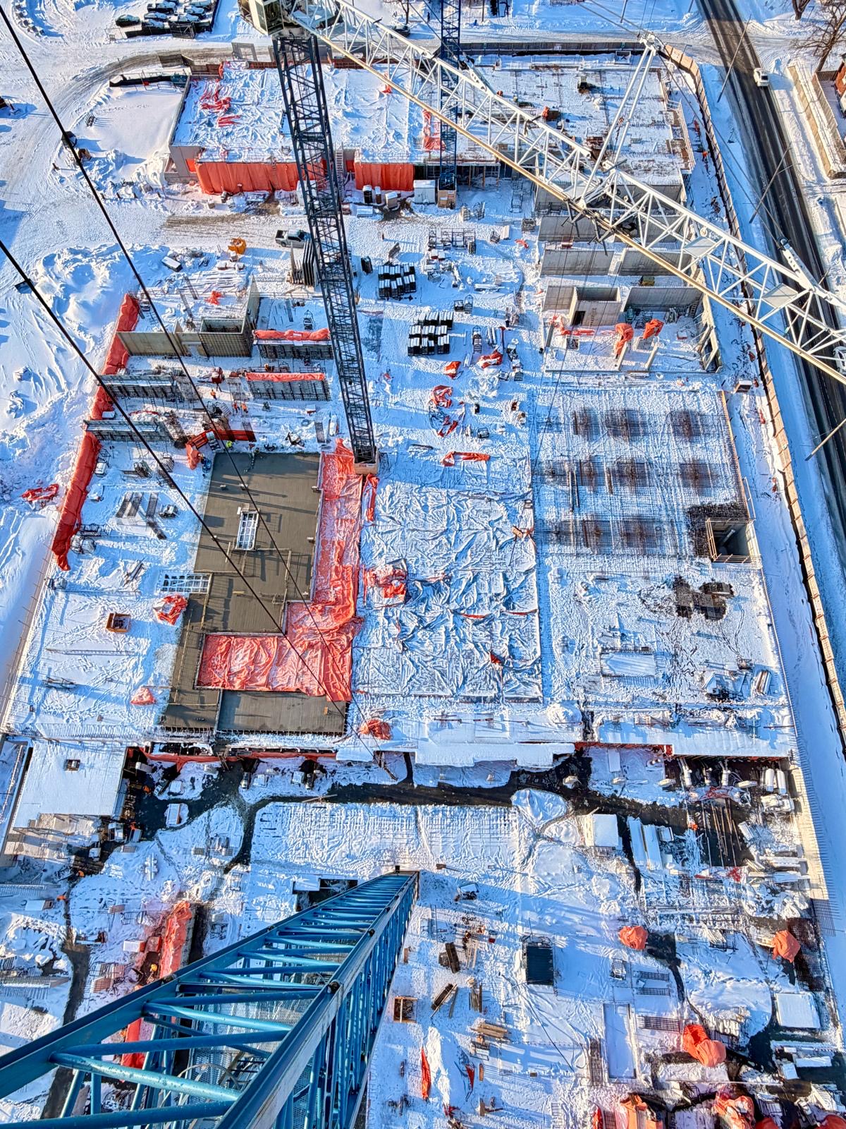 They are working flat-out 5 days a week, with all 3 cranes going. It is a big site. I suppose that the snow and cold have slowed things down a bit, but I wouldn't call it slow. They started in a huge, deep hole, and now they are rising above the hoardings. It is difficult to show the progress over the whole site in pictures now that things are above ground. Projects around the region that have risen faster are much smaller in footprint.