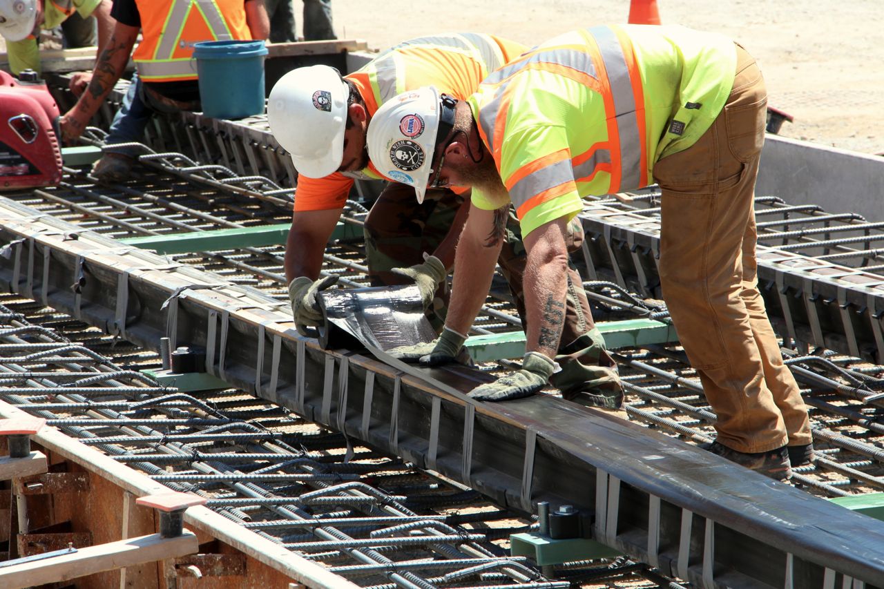 I believe someone had asked a few days ago what the black stuff was on top of the rails, before a pour. Answer: It's more duct tape! Big, wide, black duct tape. This keeps the concrete out of the flangeway, and off the rail head.
