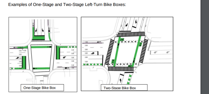 The region as part of their bike lane pilot project gives an example of each kind of box in their presentation: