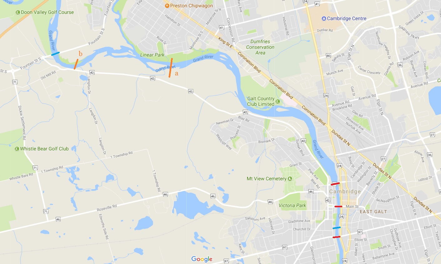 Aside from the couple small places in Blair and the Rare reserve, there isn't a whole lot of anything on the west side of the river between Galt and Kitchener. There's a stone pier in the river near your "b" line on the map so maybe one day that could be used for another pedestrian bridge but it's pretty close to Fountain street I think they'd be better off just improving the short section of trail that runs along the river, it's been washed out a bunch this year. I also think the GRCA would be loath to allow any kind of development on this stretch of the river.