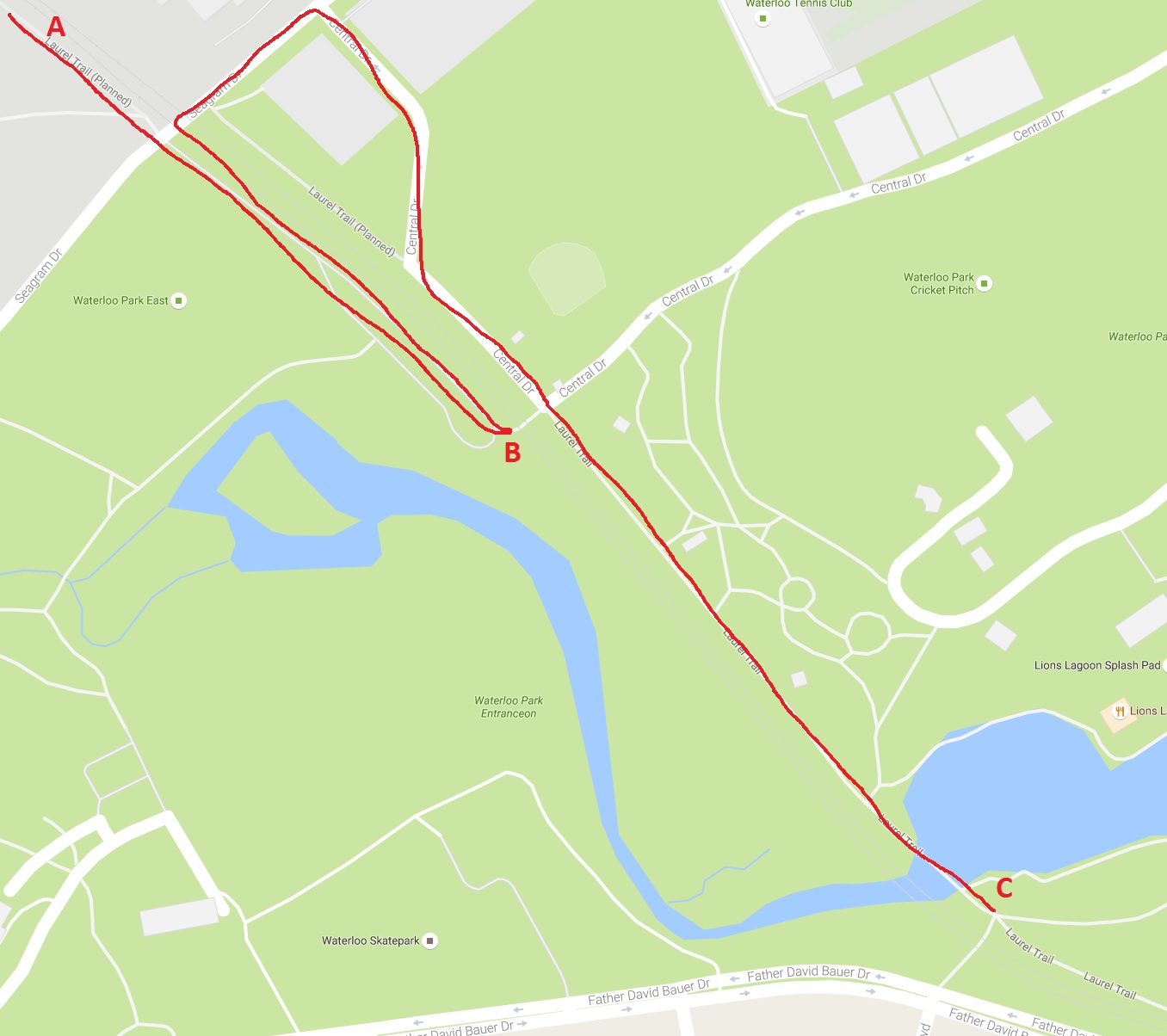 Ohhhhhhh, so this is the problem?  A is the start, B is the point of realization of the closure, and C is eventually where they're headed? Would a simple "Trail Closed - Please turn Left" sign at the North end of the ion platform (Seagram at the Trail/Tracks) not solve 100% of this problem?