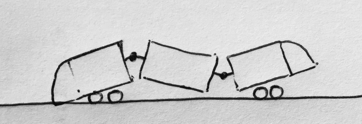 Even worse, even if the bogies truly were fixed axles directly mounted on the bogie frame, and we had pitch articulation between them, if the centre module were overloaded (say, by too many passengers), this would happen: