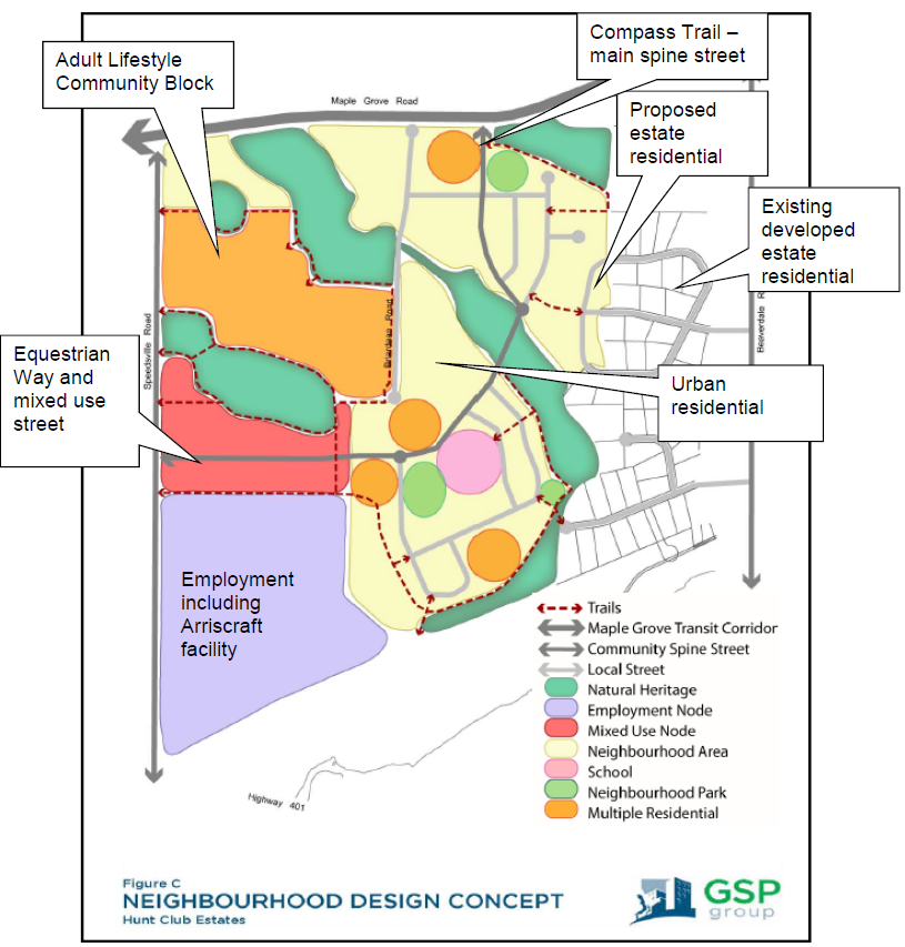 Hopefully Speedsville Road will be improved with the Hunt Club subdivision, or it will at least justify an improvement. Speedsville Road north of the 401 has a very poor, rural cross-section and is in need of improvements. The road is a good connection to Kitchener and Guelph via Kossuth Road to the north.