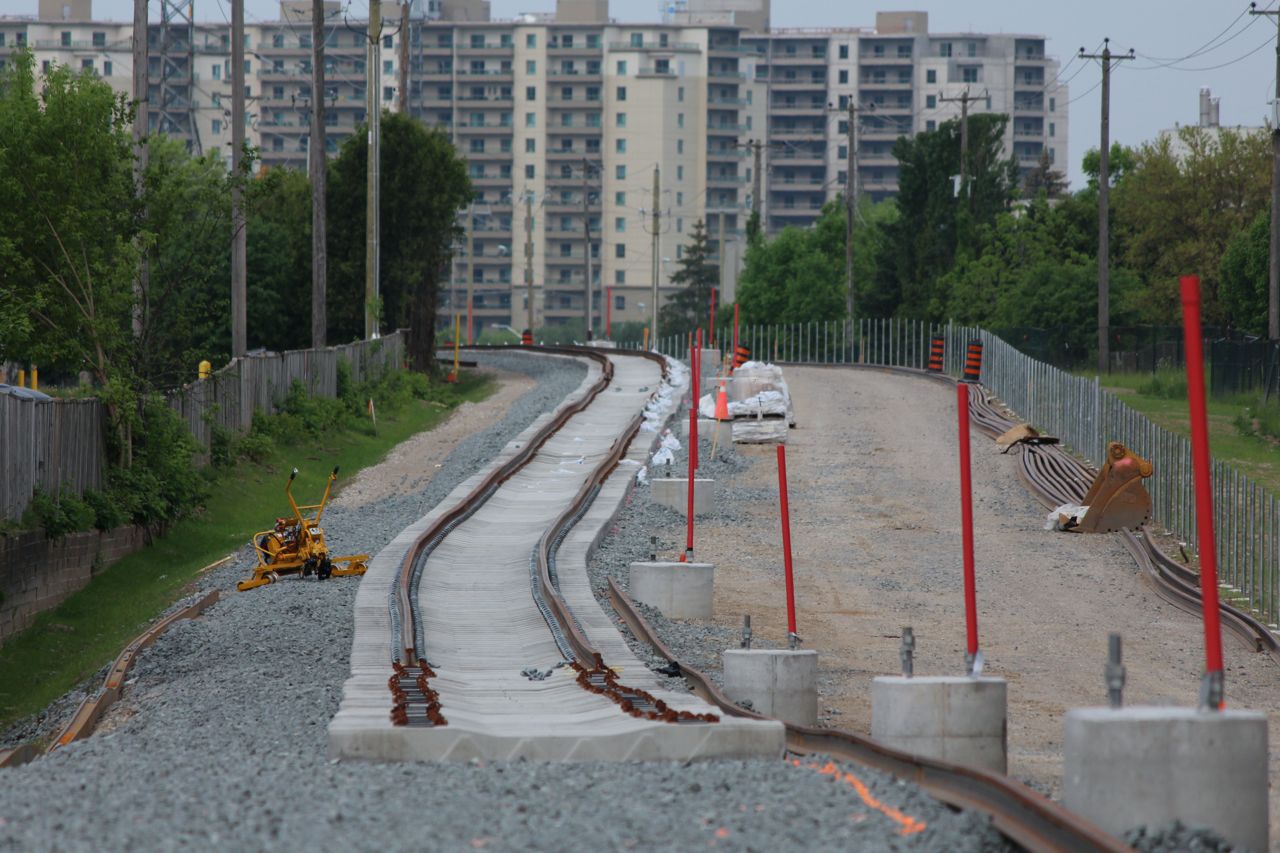 Also, here's a great little video clip from Matt Morris on Twitter, showing how they're doing the embedded track when the rapidway runs down the centre, and the concrete between the rails is lower to make room for the flanges.  Neat custom device!