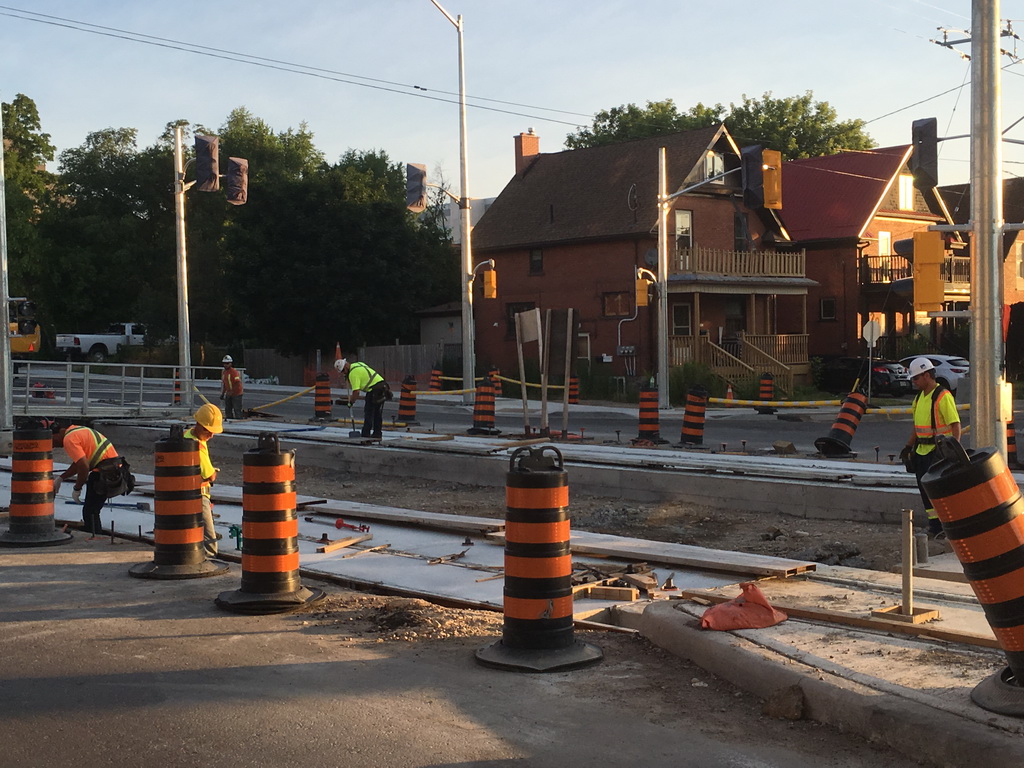 The small gap in concrete near the Crown Plaza is ready to pour. First concrete has now been poured at the Cedar crossing, with a frenzy of work going on at this intersection. Southbound rails at Madison are ready to be welded. Northbound rails are still AWOL, though. Back at Queen/Ontario, the Full Circle driveway has been moved temporarily and the crews are working on getting the track ready in front of the previous driveway.