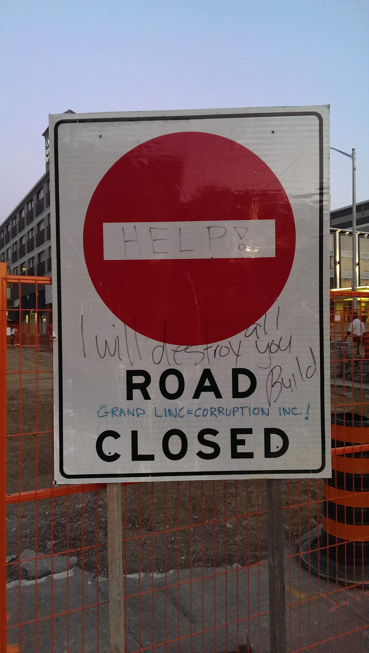 Grandlink has constructed a fairly elaborate pedestrian crossing around Allen. The spur line tracks are still disconnected at King. I assume they don't have to have them put back over the weekend. Road closed sign at Frederick and King. Clearly some discontentment with the construction.