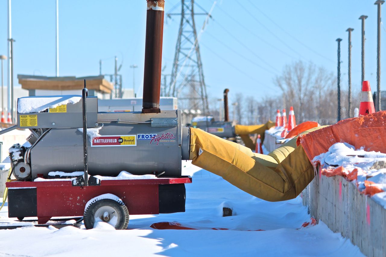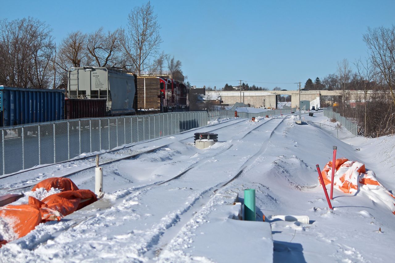 Crews out busy as ever on a Sunday, no less, pounding away on Hayward. Graybar is on the right there. The guy in the background has a cool job - that's a gas-powered leaf blower, and he's blowing out snow from the trackwork. Huron Spur, looking toward Mill/Ottawa, from Hayward. Mill Station, looking back down toward Hayward, along the Huron Spur. I get a kick out of the disparity in arm length here at Seagram.