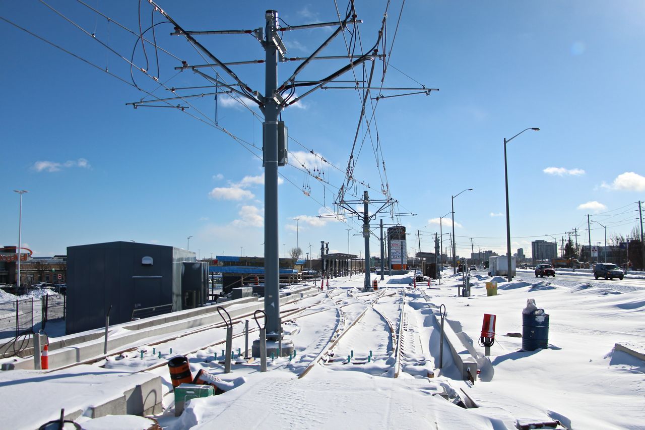 Showing the 300 mm stagger of the contact wire, to prevent wearing a groove in the pantograph. Those wacky crossing arms. Seagram/Laurier/Waterloo Park station. You'd think it was already open, with those footprints. Srsly, is this not the world's largest? Weber, just South of the OMSF. Note the more permanent guarding up now to prevent accidental contact with the... contact... wire.