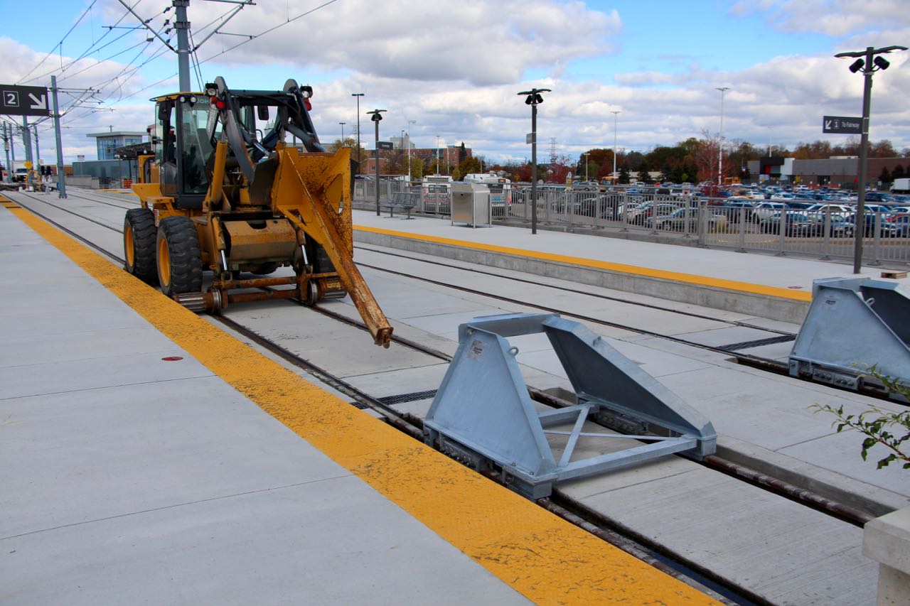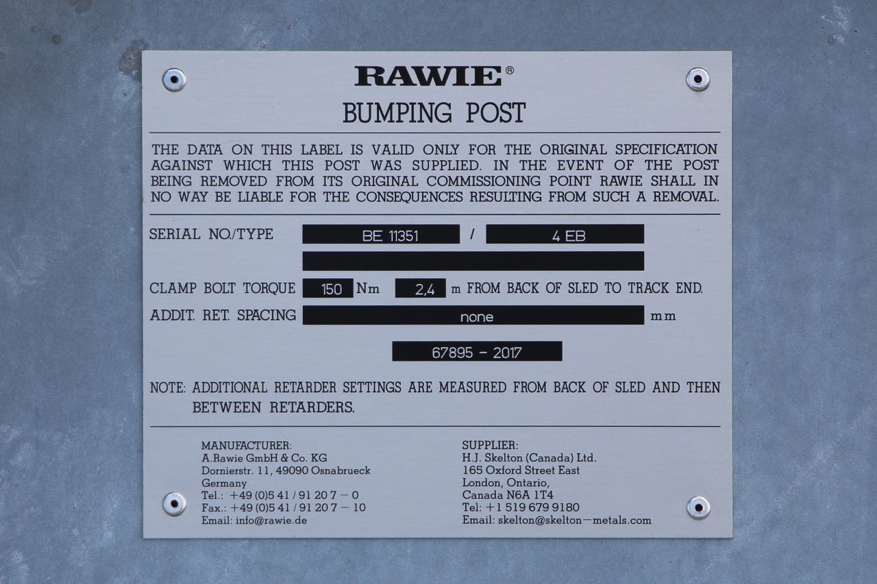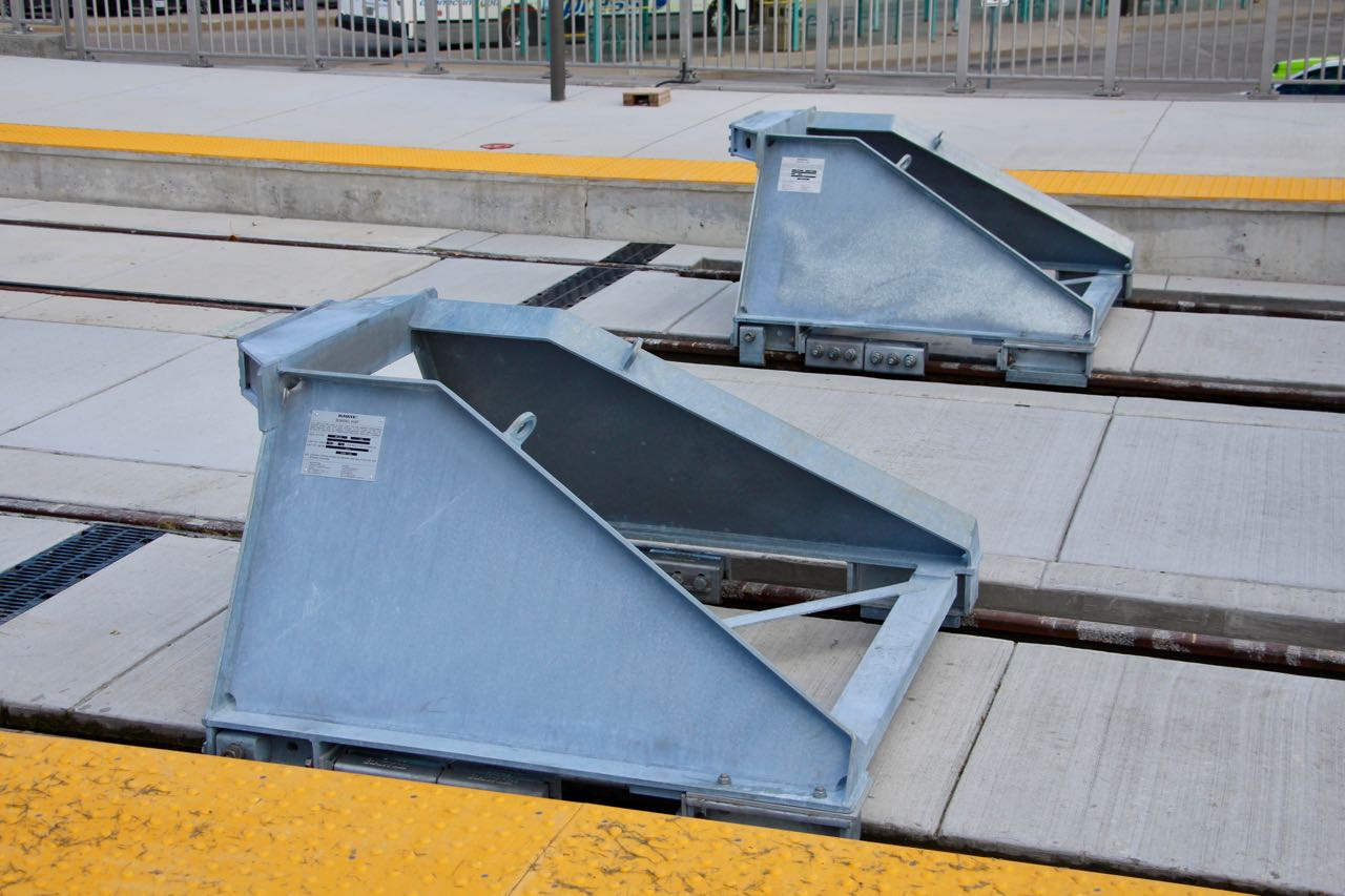 Installation of the "bumping posts" happened today at Conestoga. Rawie seems to make almost all of these around the world. Functionally, the bumping post can slide along the track. As you can see, there's a clamping element that is attached to the rail head. It closes around the head with springs, and a specified force can be applied. So, when a train impacts the bumping post, it can slide along in the same direction with a carefully engineered resistive force. The clamp at the train-end prevents that end of the bumping post from lifting up (which is why it wraps around under the rail head).