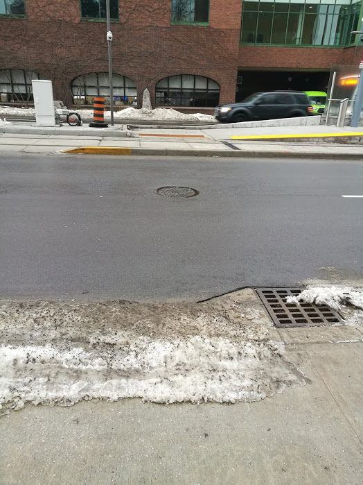 There is a similar problem at Grand River Hospital, north end of the platform. What I find weird about these is that the design is contradictory — on one side of the road there is a texture plate, which implies that there is a crossing. But then on the other side there is none, and in some cases no curb cut. Or as here there is a two-sided curb.