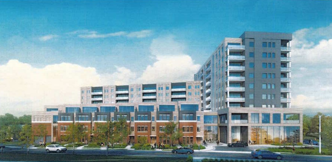 The developer (which turns out to be Polocorp, who also developed Barra) is now at the next step, requesting zoning variations to allow up to 10 storeys and down to 1.1 parking spaces per unit. There are two new renders, with alternative elevations.