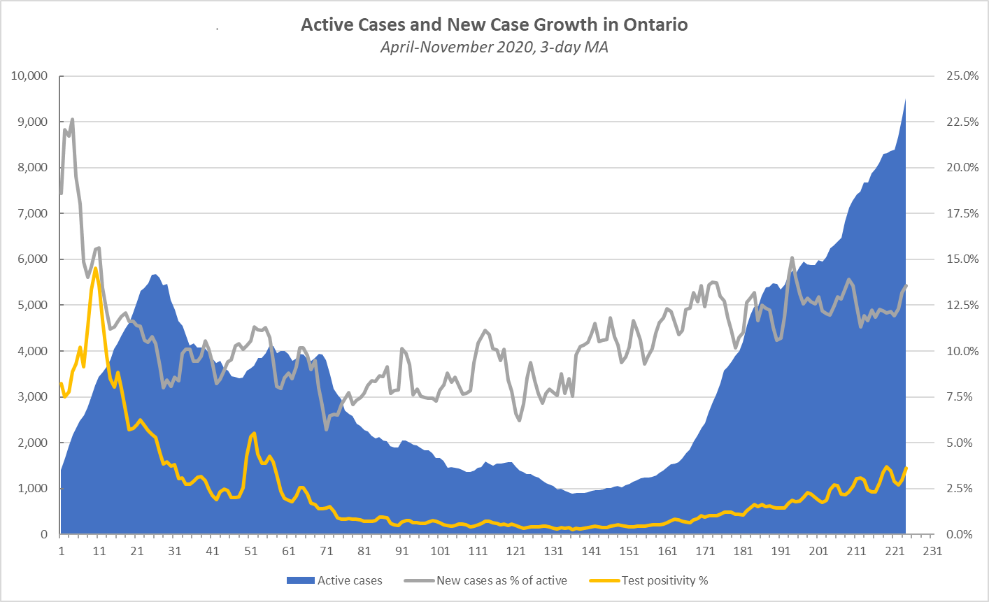 RE: The COVID-19 pandemic - ac3r - 11-09-2020 Oubtkreak declared at Algrave Restaurant. 6 infected, and up to 175 exposed between October 28 to November 4: https://www.cbc.ca/news/canada/kitchener-waterloo/waterloo-region-covid-19-update-november-9-1.5795428 RE: The COVID-19 pandemic - tomh009 - 11-09-2020 Yeah, I said I would write something. I'm not feeling good about this. We all know how much new cases have shot up, but to me even more alarming is the inexorable rise in active cases. Active cases, in combination with the R0 rate, drive the new infections, and both are up quickly. New cases at over 10% of actives will drive this growth as cases cannot be resolved at this high a pace. (The average/median severity is lower than in the spring, but both hospitalizations and deaths have been increasing as well.) The chart shows how we have been over this 10% level since about August (look around day 141) -- and that's where the rise of the active cases really started. The other factor that I am really concerned about is testing and tracking. Our test positivity rates are now over 3%, from below 1% in the summer, indicating that we are not doing enough testing. Ontario is averaging about 35,000 tests per day for the past month, well below the test processing capacity, which is at least 50,000. Ford said he will increase this to 100,000 per day, but that would require tripling the collection of test samples, not just the processing of samples. Where is the issue? Are there capacity issues, and people can't get tested -- or not enough people are interested in getting tested? And tracing ... I believe we are sadly lacking here. The smartphone app is good, but not enough people have it for us to be able to rely on it. Clearly we are not able to effectively trace the contacts, given how fast the infection rates are increasing. The one positive note is that Pfizer's phase-three tests for their mRNA vaccine look very good so far, with 90% efficacy, better than I dared to hope, and no significant side effects. And there are still other vaccines in the pipeline, including other mRNA ones. We don't know yet how long the protection lasts, though. Canada has an order in the system for this one so we should be seeing significant numbers of doses here in early 2021. Administering those on a mass scale will be a huge effort, but hopefully there are smart people thinking about the logistics of this already. Still, I worry about the current situation, and whether we can control the infection rates enough for the next 3-6 months, until the vaccine can be administered in mass quantities. It's not Europe, and it's not the US, but we have a big challenge in front of us, even so. RE: The COVID-19 pandemic - Bjays93 - 11-10-2020 (11-09-2020, 02:32 PM)tomh009 Wrote:Less people are being hospitalized because we know more and have some methods to help lessen the severity of the illness and know a little better how to treat it then we did back in March.(11-09-2020, 02:01 PM)ac3r Wrote: The rise in European cases is unique, because they're finding they are not admitting as many people to hospitals as before, nor as as many dying. It'd be nice to see that happen here in Canada as things rise, but we'll have to see: https://www.theglobeandmail.com/world/article-european-covid-19-cases-are-surging-but-the-death-rates-remain-low/ Hospitalizations lag by nearly a month though, and so even if cases start going down, the hospitals haven't seen the worst of it. Once hospitals get overwhelmed it doesn't matter what percentage of people are hospitalized. The situation becomes dire very quickly. RE: The COVID-19 pandemic - ac3r - 11-10-2020 Another record broken in Ontario today. 1388 new cases: https://www.cbc.ca/news/canada/toronto/covid-19-coronavirus-ontario-november-10-update-1.5796429 RE: The COVID-19 pandemic - tomh009 - 11-10-2020 TUESDAY 2020-11-10 Waterloo Region reported 42 new cases for today (19.8% of the active cases!). 225 new cases for the week (+23), averaging 19.0% of active cases (ugh). 230 active cases (+101 in the last seven days). An average of only 692 tests per day for the past week, less than at any time since early September, resulting in an all-too-high 4.65% positivity rate. Hello Waterloo Region, why are we not testing more? Ontario reported 1,388 new cases today with a seven-day average of 1,154 (+48). 781 recoveries and 15 deaths translated to an increase of 592 active cases, and a current total of 10,106, blowing past the 10,000-case mark. +1,811 active cases for the week, and 94 deaths. 29,125 tests resulted in a 4.77% positivity rate. The positivity rate is averaging 3.46% for the past seven days. ICU bed count is down slightly at 82 (-2) but the overall hospital population is now up to 422 (+65 in the past week).