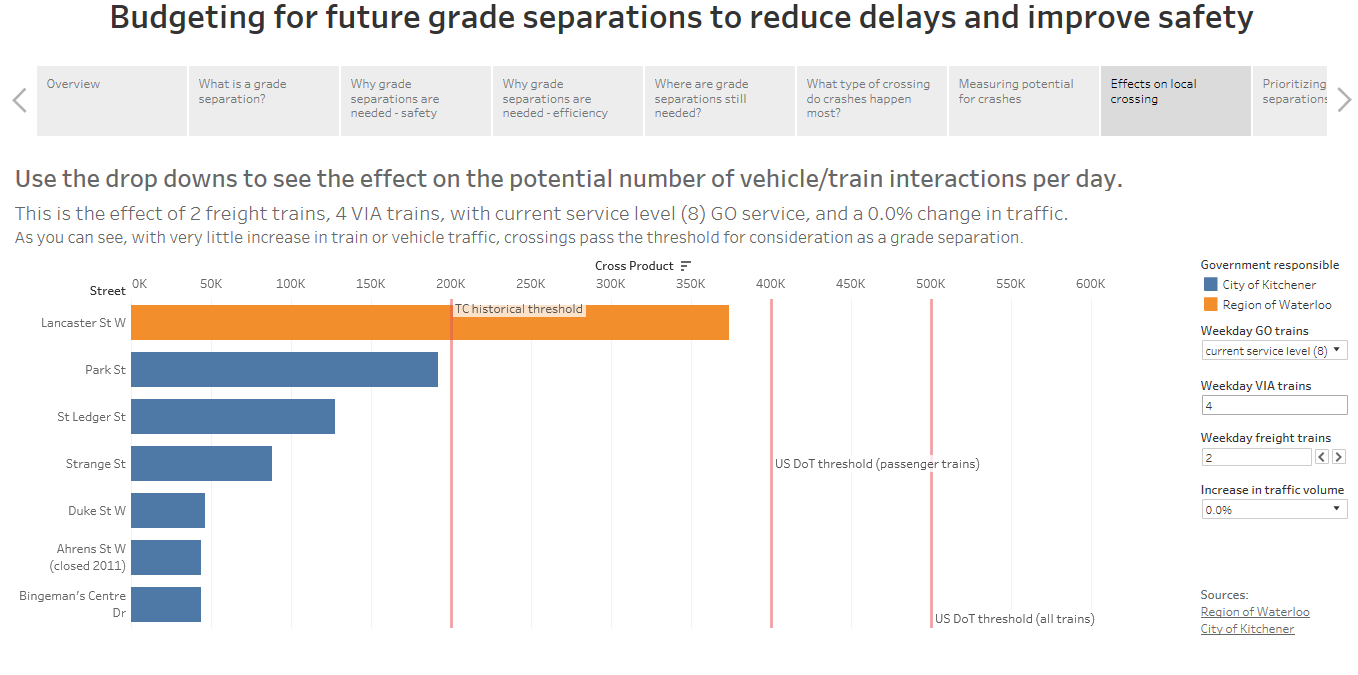 Local Budgets - Pheidippides - 12-11-2016 Having looked through the Kitchener and Regional capital budgets for 2017-2026 I find it odd that no additional underpass/overpasses will be constructed across the GEXR line (Strange/Park/Duke/St Ledger/Lancaster). I would have thought that at least one would be on the books for the 10 year window or maybe even two (one every 5 years). Worse yet it looks Lancaster is to be completely rebuilt Union to Victoria in 2020 meaning if it is not fixed now it would not likely be replaced for 30 years. I think that is short sighted. With the positioning of the GO layover facility being east of the multi-mode hub and Kitchener being the end of the line it means every train has to cross Duke/St Ledger/Lancaster twice each trip. At the moment that isn't bad with 4 round trip GO, 2(?) VIA, and 2(?) freight trains, but if you start adding hourly GO service or better the number increases rapidly and severely interrupts the flow of pedestrian, cyclist, transit, and vehicles using these roads and increases the number of potential opportunities for crashes (cross-products). Lancaster is already pushing the suggested threshold for a grade separation with the current levels of rail and vehicle traffic; all day service with put it well over the threshold. Also, I think the trains could run faster if there weren't so many level crossings as well making the trip times to Toronto a little shorter. If HSR ever comes to fruition these changes will need to be made regardless so why not get ahead of the game (other than if HSR is a go then the province and feds might pay for the new bridges). I also did not see any items in the capital budget (or leisure facilities master plan) for leisure facilities downtown. More and more people are living downtown, but there are no proper indoor tracks, swimming pools, community kitchen, maker space, gymnasiums, etc. for these new residents to use (unless their condo comes with it, but that doesn't build community) and residents will need to leave the core to access them. Currently all the proposed investments are in new or refurbishing facilities in the suburbs; this needs to be rebalanced to keep downtown attractive. RE: Local Budgets - panamaniac - 12-12-2016 I think you have forgotten the Cameron Heights swimming pool. I don't know what their programming is like, but the Downtown Community centre has a gymnasium, does it not, in addition to its other facilities? Also, although it's not a municipal facility, themuseum recently opened a maker space for children, the Underground Studio. There's also kwartzlab on Kent at Charles, although again that is not a municipal facility. I had never thought about a community kitchen, but it would make an interesting addition to Downtown. I'm a bit surprised that none of the Downtown churches, with their large kitchens, have started something like that. I wonder if there are legal/health issues that prevent it? And not that I think there shouldn't be more facilities Downtown, but keep in mind that the City in recent years spent beaucoup dollars on the wonderful expansion of the KPL. RE: Local Budgets - ijmorlan - 12-12-2016 (12-11-2016, 09:58 PM)Pheidippides Wrote: Having looked through the Kitchener and Regional capital budgets for 2017-2026 I find it odd that no additional underpass/overpasses will be constructed across the GEXR line (Strange/Park/Duke/St Ledger/Lancaster). I would have thought that at least one would be on the books for the 10 year window or maybe even two (one every 5 years). While I see your point about Lancaster, I think it’s far from clear that a separation at Duke is required. People can (will be able to) use King or Weber. Also, I don’t see why HSR would require grade separations in these locations. They are close to the station and the trains can simply run at non-“H” speeds through there. This is why regular HSR is usually better than maglev and other exotic technologies (and incidentally the same major reason why LRT is more popular than monorail). Additionally, with two-way GO service, you are back to one train movement per scheduled train because the train can simply reverse at the station to begin its return journey — no need to visit the depot except at the end of the day. The real problem at Lancaster is the long crossing occupancies by switching activities. Trains just going through like the GO trains are much less of an issue. RE: Local Budgets - timio - 12-12-2016 (12-12-2016, 05:22 AM)ijmorlan Wrote: The real problem at Lancaster is the long crossing occupancies by switching activities. Trains just going through like the GO trains are much less of an issue. I anticipate this will be more of an issue in the next few years when Victoria is closed and Wellington/Shirley/Bingeman's Centre Drive is one of the primary detour routes. It's already potentially dangerous when people are backed up across Victoria during GEXR switching. Anticipate the lineups with a larger number of vehicles turning there. RE: Local Budgets - Pheidippides - 12-12-2016 (12-12-2016, 05:22 AM)ijmorlan Wrote: Additionally, with two-way GO service, you are back to one train movement per scheduled train because the train can simply reverse at the station to begin its return journey — no need to visit the depot except at the end of the day. That is my point, each train crosses Lancaster and stops at Kitchener station and then would cross Lancaster again on it return journey (whether that is to the depot or back to Toronto). Also, I had considered Cameron's pool, but I don't think it is accessible which will be a requirement and necessity going forward. RE: Local Budgets - danbrotherston - 12-12-2016 I would expect any needed underpasses/overpasses for GO Expansion and HSR to appear in provincial budgets. RE: Local Budgets - Markster - 12-12-2016 The region just bought 3 brand new rail over/underpasses in the past 3 years. (King, Weber, Margaret) That's as many as they did in the, what,