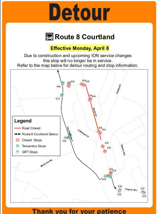 Route 8 via Courtland & Weber is being detoured to future Route 6 Bridge-Courtland routing effective April 8 due to construction and impending ION-related Service Changes.