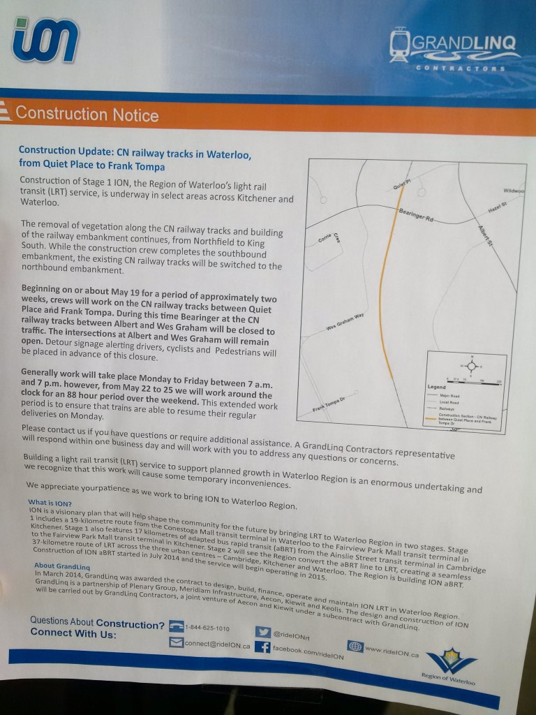 Columbia Street from Hagey to Phillip will be closed starting this Monday May 25 for approximately two weeks for ION track construction. Very exciting.
