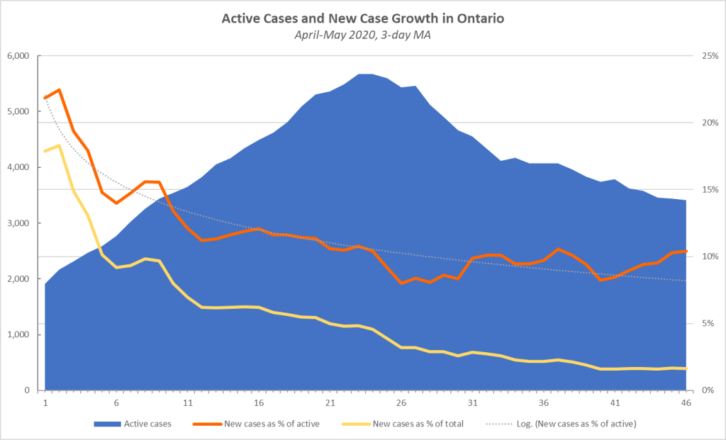 Ontario new-case count up 304 today, a 1.3% increase on the total and 8.9% of active cases. 304 recovered and 23 dead for a net increase of three active cases. There are now 3,415 active cases, given 17,638 recoveries and 1,904 deaths.