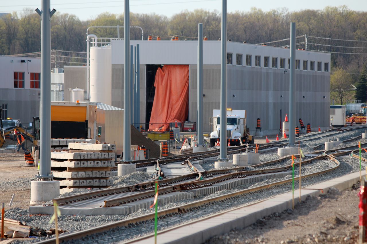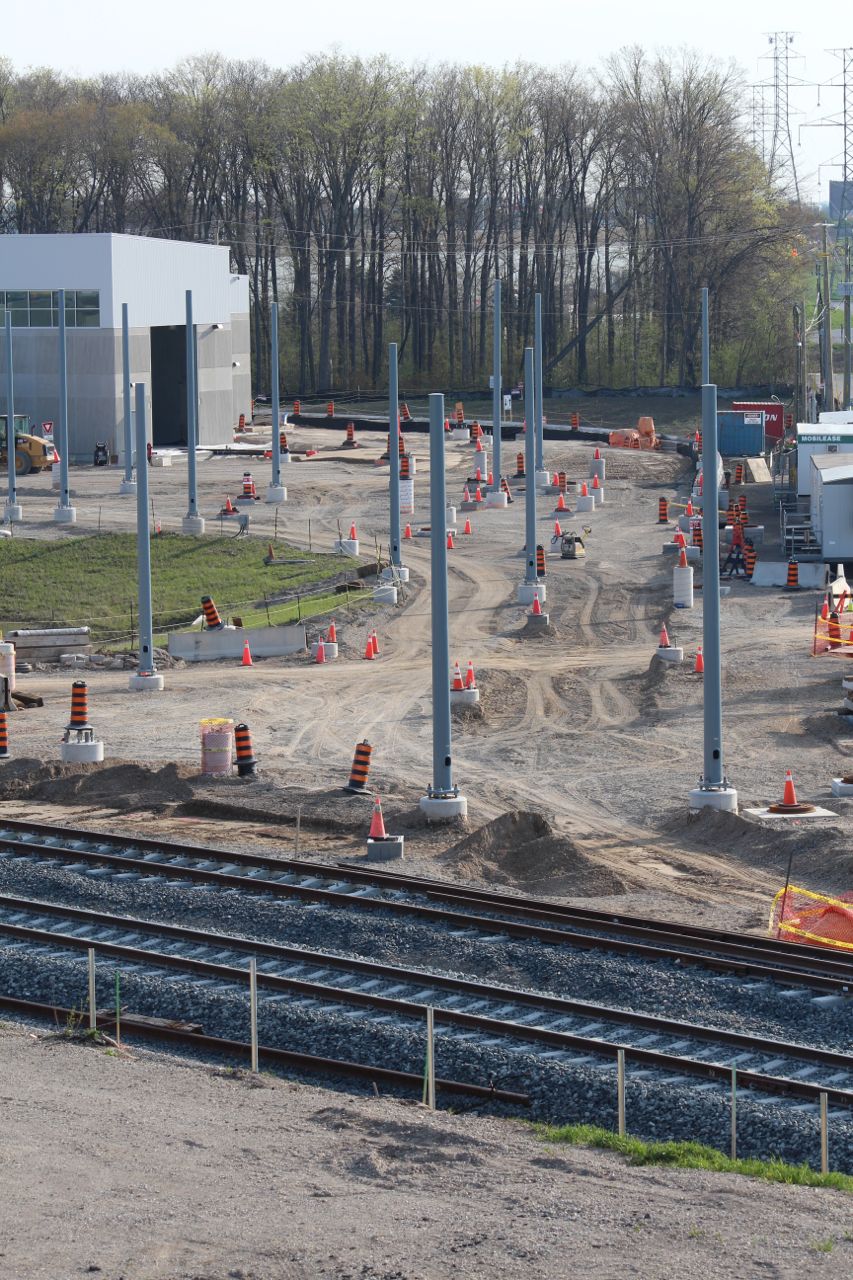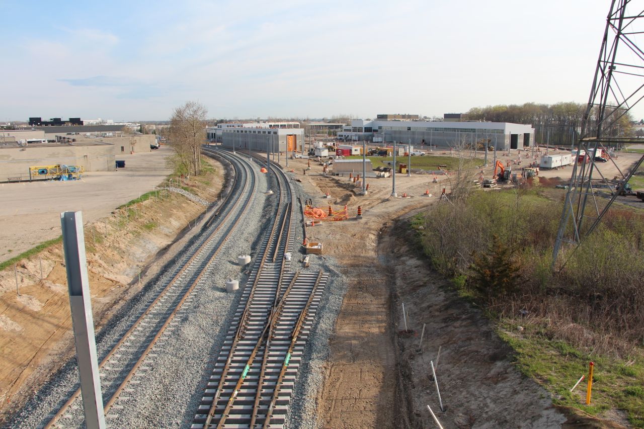 In the foreground, a crossover to permit LRV's on the Southbound track to cut over momentarily to the Northbound track, to get into the OMSF. The switch further way, and the track on the right is for the freight line which continues North to Elmira. It's interesting to note here that the switches for freight are of the movable frog type, while the switches that will only be used by ion's trains are much more basic/lightweight.