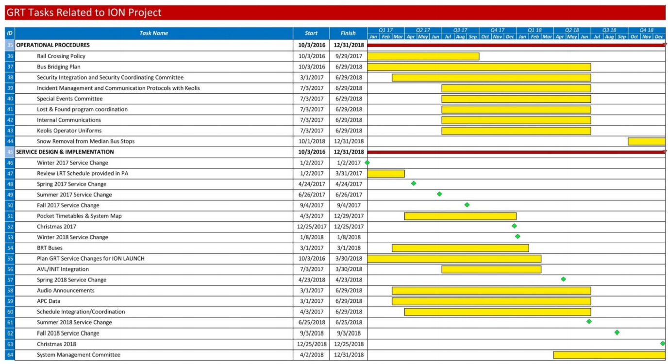 Some of the timelines have already passed and some of them do not seem to make sense. For instance, the Ion safety campaign is scheduled to end when revenue service starts?