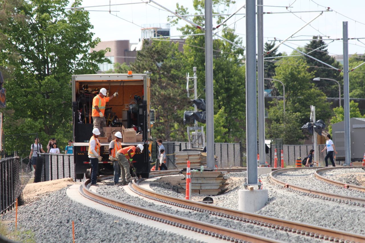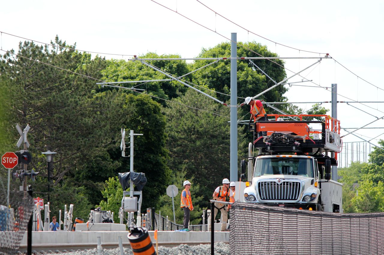 Crews working on the OCS/Catenary system at the Seagram/Laurier/Waterloo Park station.