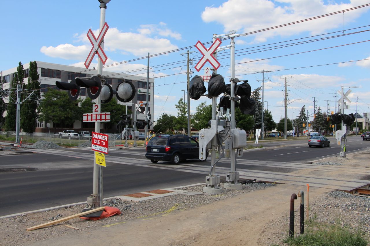 I noticed that the Seagram signal crossing poles differ on the number of tracks that you are crossing. When you are heading west, the left hand (north) signal indicates 3 tracks while the right hand (south) signal indicates 2 tracks. I could see arguments for either case. Realistically there are only 2 paths/tracks at the crossing, but thanks to the gauntlet track there are 3 pairs of rails. There must be an arcane piece of Transport Canada regulations being interpreted here.