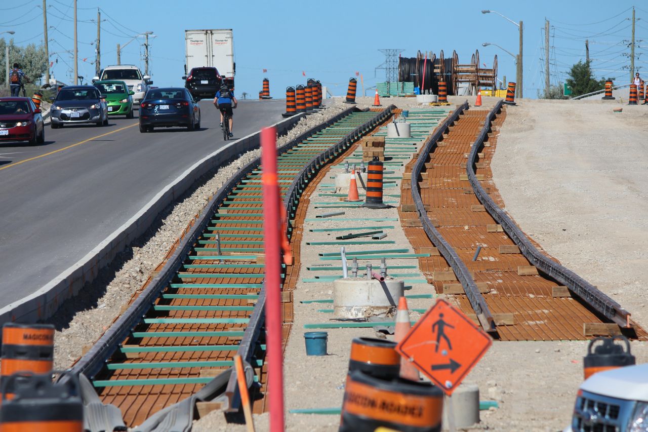 ![]() ![]() These threw me off at first because they looked backwards. Then I realized I'm used to seeing them build centre platforms; these will be side platforms. View of things from the Conestoga Road end: ![]() Lane-reduced King Street: