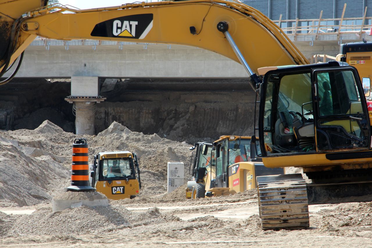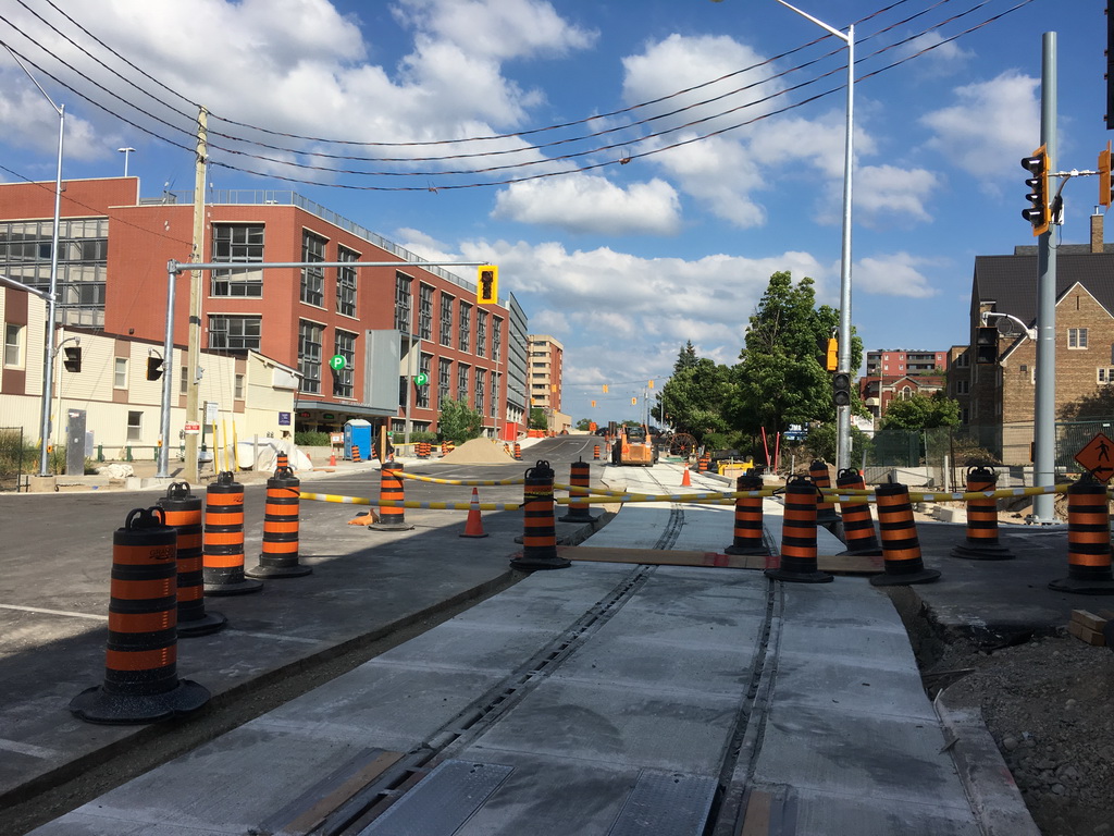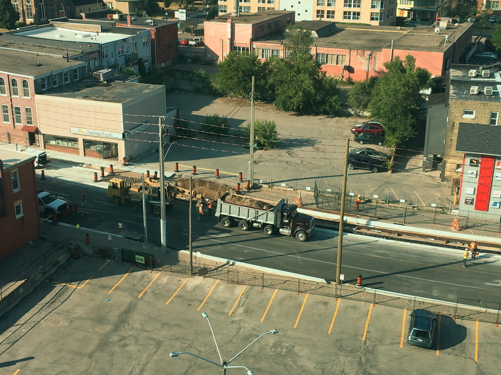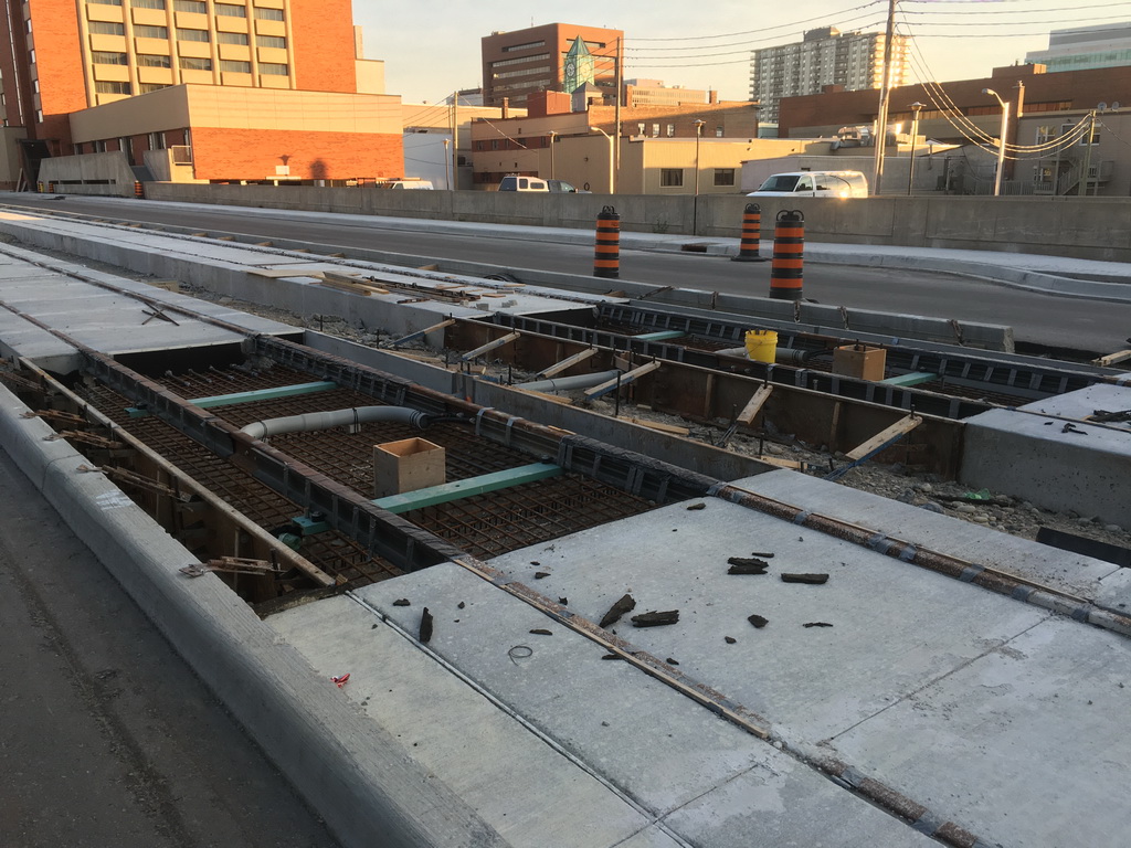 The small gap in concrete near the Crown Plaza is ready to pour. First concrete has now been poured at the Cedar crossing, with a frenzy of work going on at this intersection. Southbound rails at Madison are ready to be welded. Northbound rails are still AWOL, though. Back at Queen/Ontario, the Full Circle driveway has been moved temporarily and the crews are working on getting the track ready in front of the previous driveway.