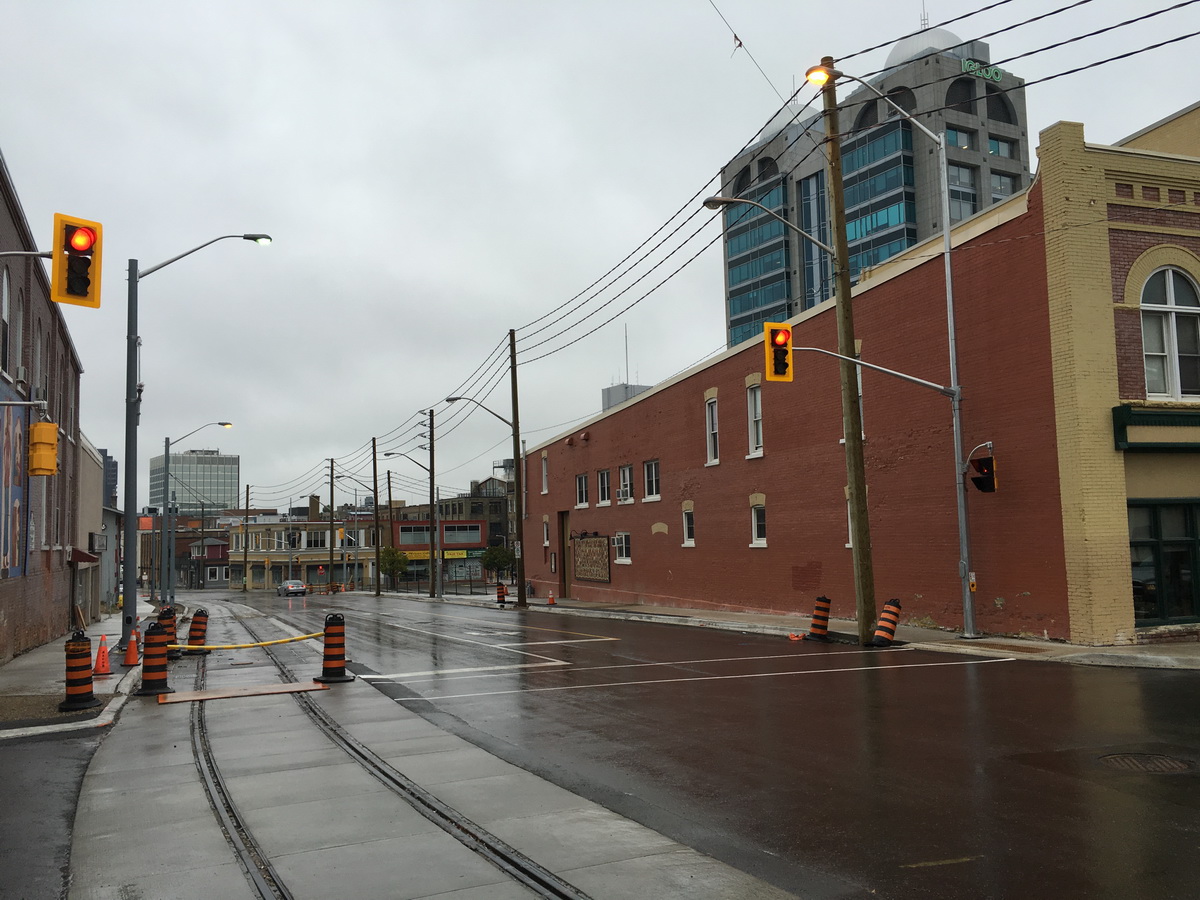 At Caroline / Erb, the last remaining curb was poured here today. There's a weld to be made, and then the embedded track can be poured, too!