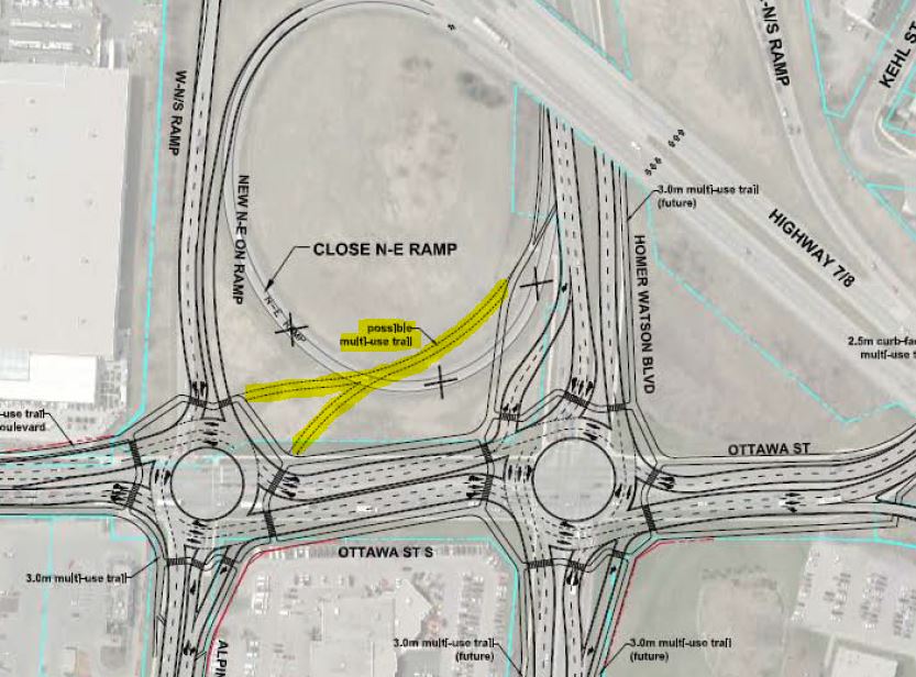 And you know what I see there? I see an opportunity for that northern path to be a trail with access for bikes. (And here with the roundabout diagram below)