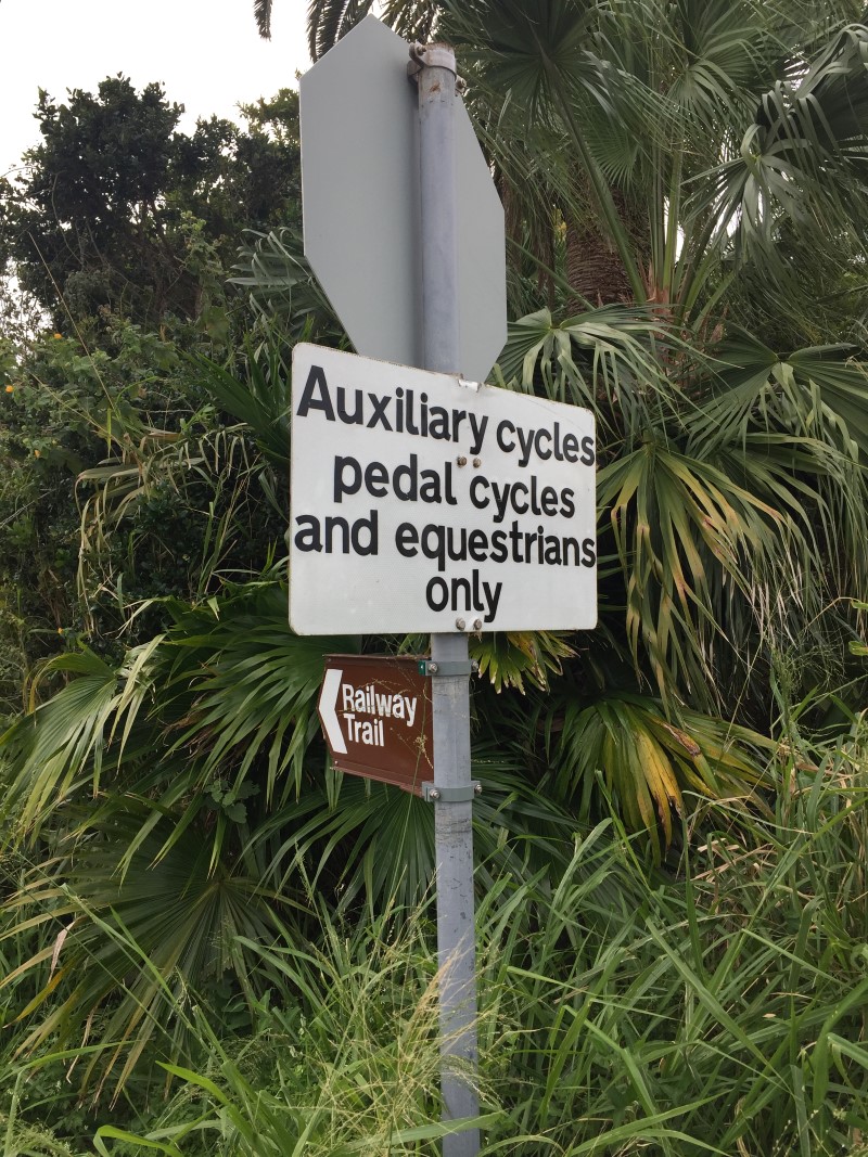 Signage at the start.  I'm not sure if "Auxiliary Cycle" is supposed to mean Moped or E-Bike, but cars and scooters and motorcycles all used the trail, too.  "That's Bermuda." became one of our favorite sayings.