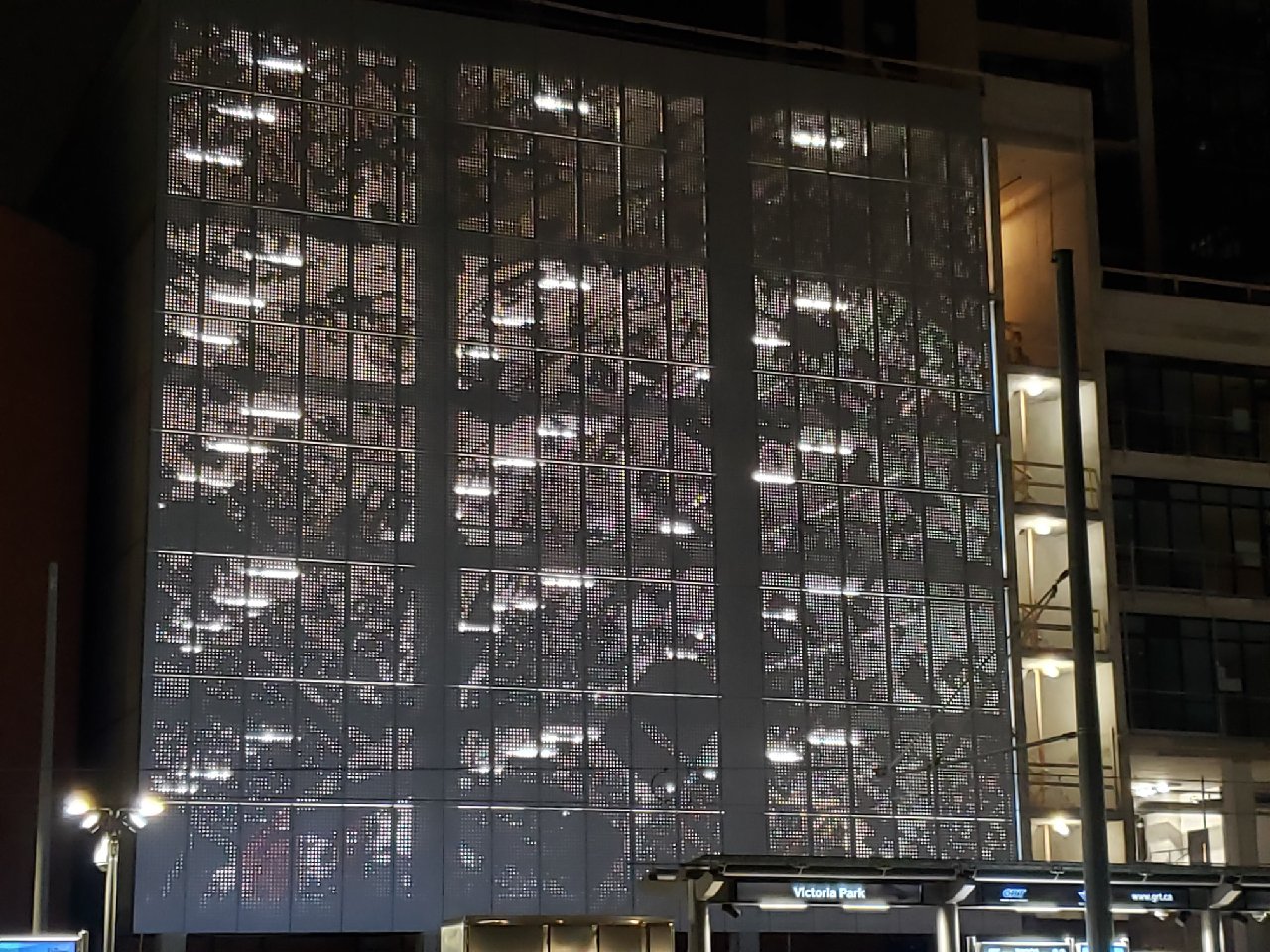 (10-22-2021, 05:44 AM)ac3r Wrote: I don't have a picture of the Charlie West garage but it's not that bad at night. If there is supposed to be a design in that metal façade then it's impossible to see. Everyone says it's supposed to be a satellite view of downtown Kitchener but I can't seem to make anything out that corresponds to streets or city blocks. It just looks like random holes in the metal that lets light in/out.