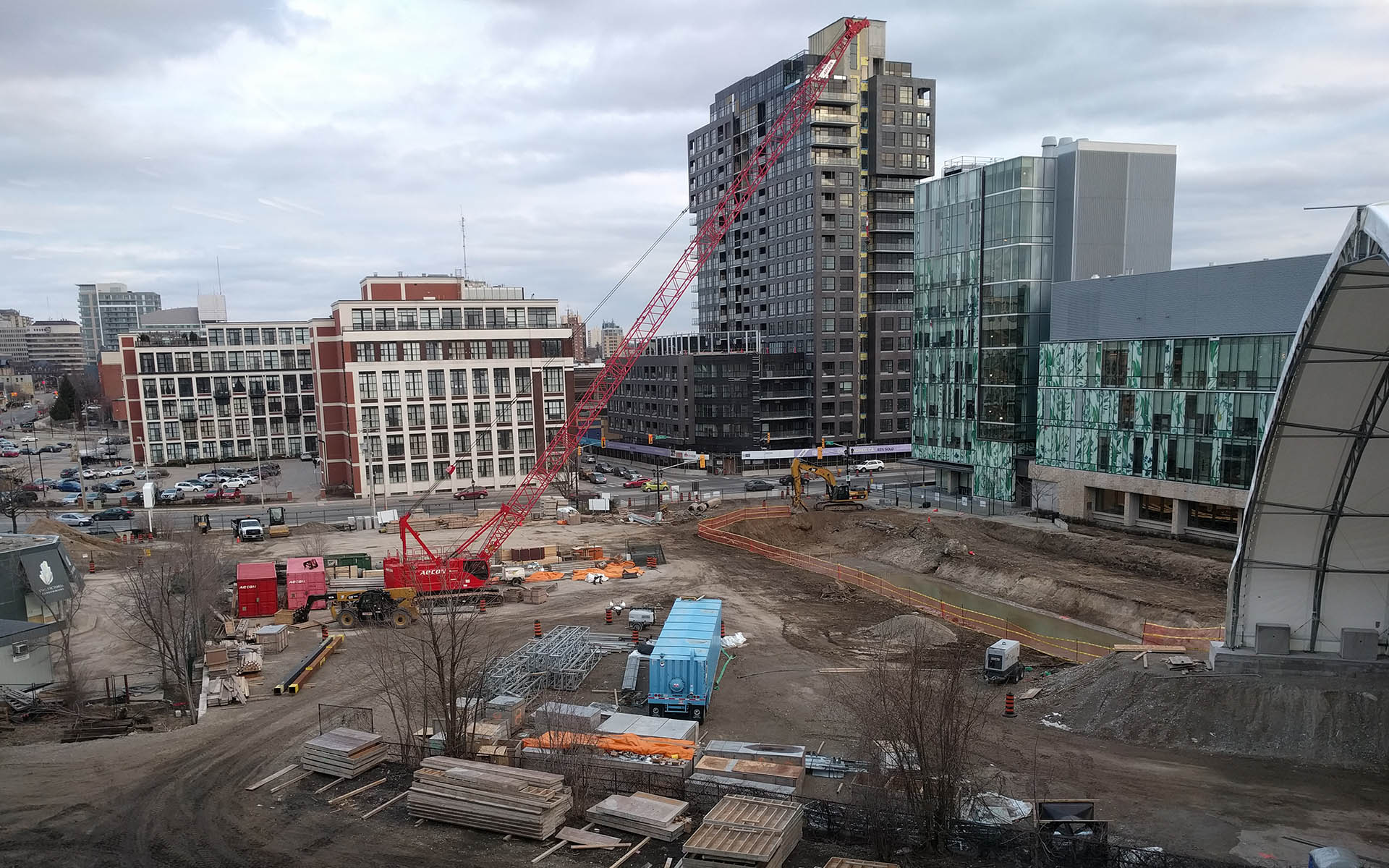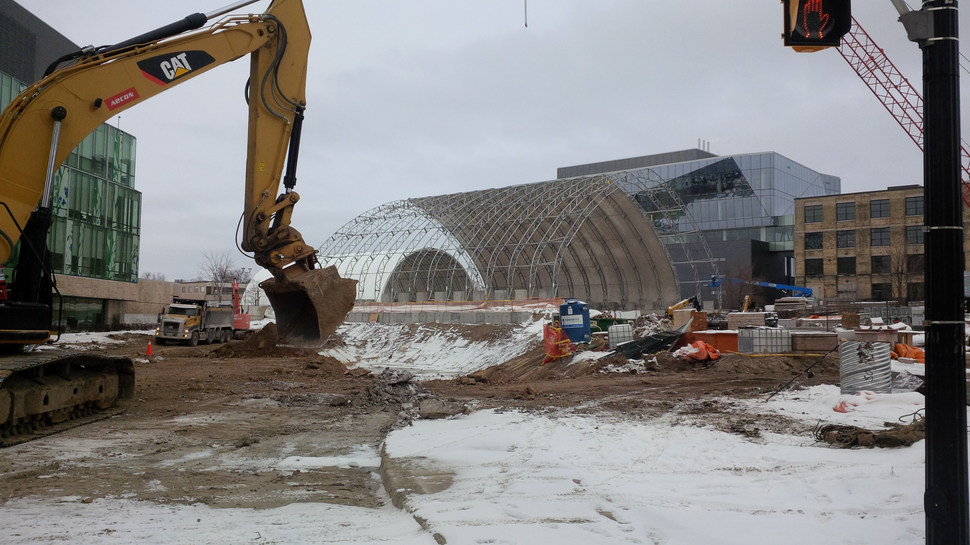 Picture from this morning. Not only is the covering over most of the North half of the larger snodome (as previously reported), they've begun excavating the surface down to the level to regrade the road (and LRT track!).