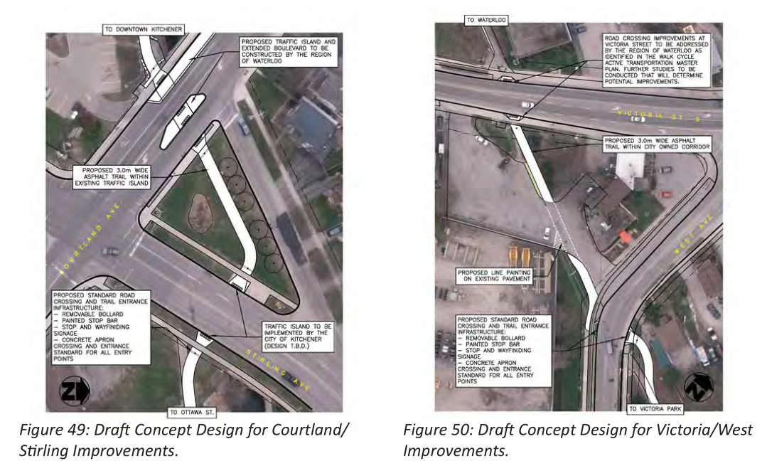 Designated pedestrian crossings away from the lights, mainly. At Courtland/Stirling, the path would cut across that median island that splits Stirling; at Victoria and West, the path would finally go straight through officially, with a marked path behind Lai Lai.