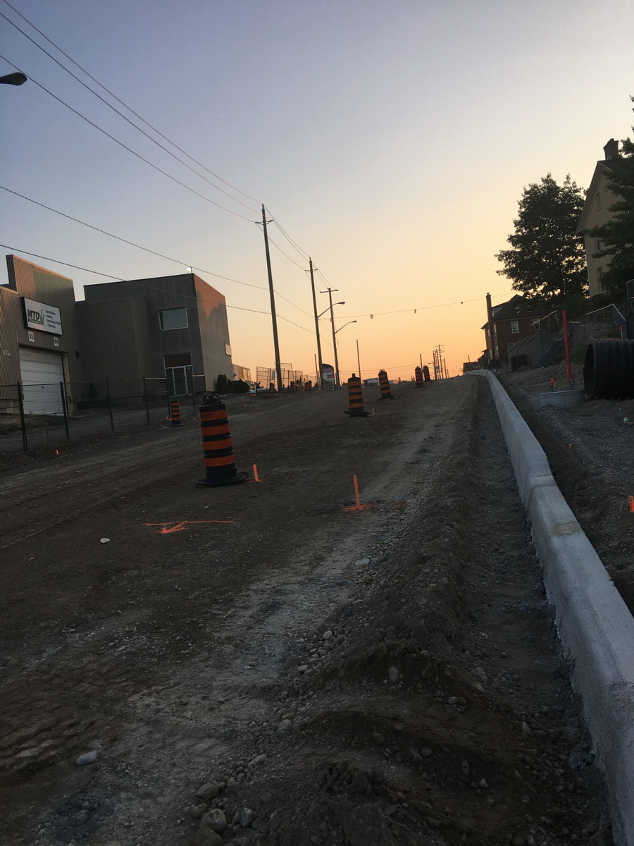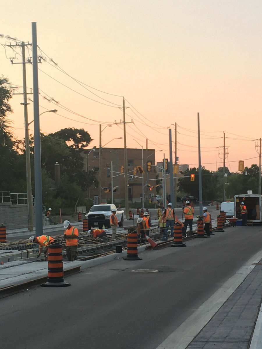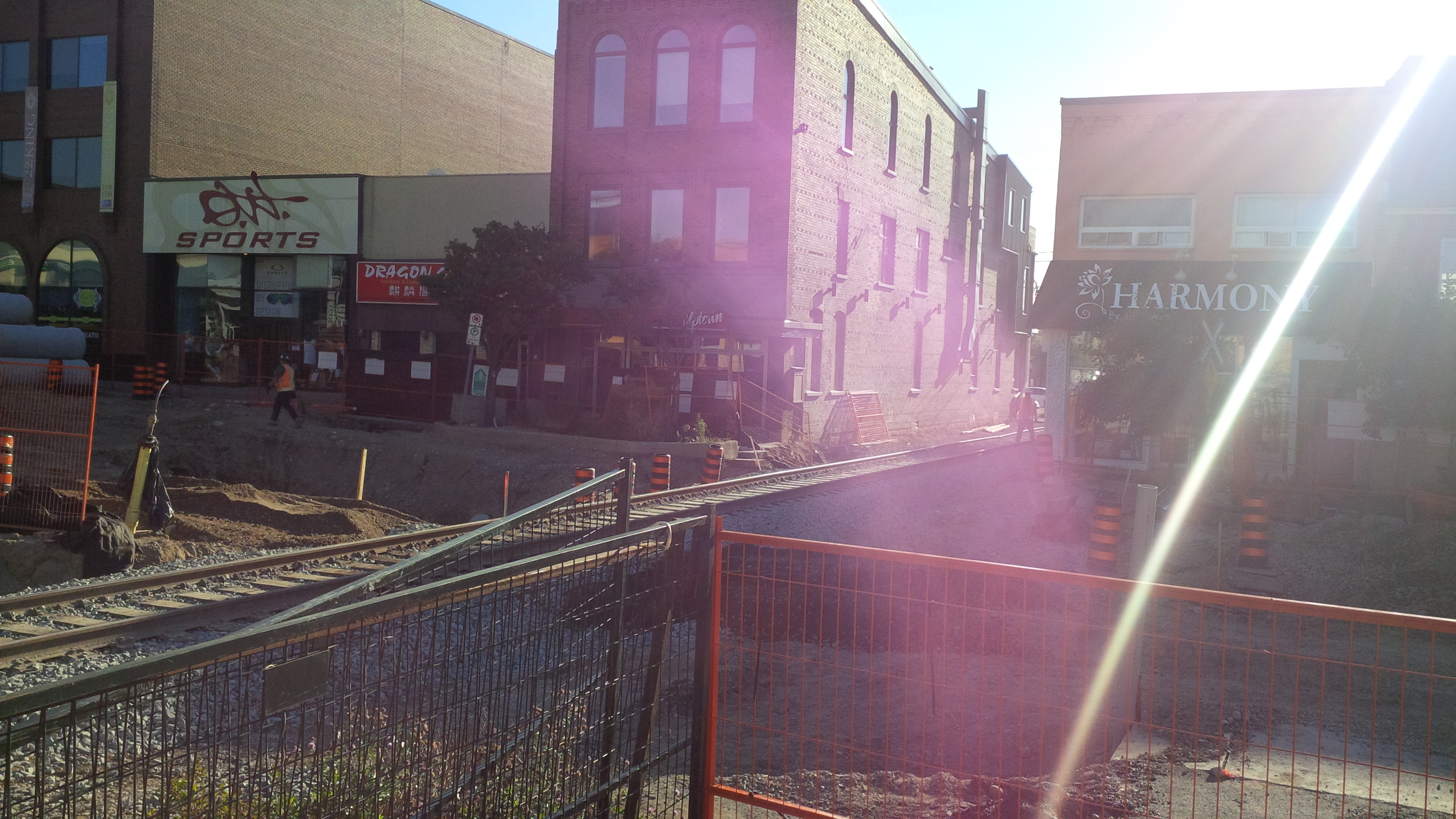The workers were having a really hard time keeping people from crossing the tracks yesterday along the town square parking lot between King and Caroline, but were always exceptionally patient when dealing with any attempting to shortcut the current pedestrian detour (currently the two options are either Caroline or Regina, everything else is closed).