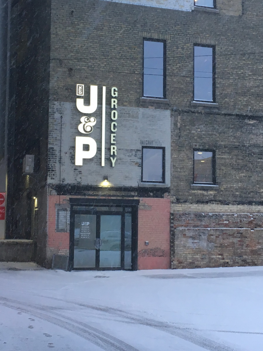 Some things go down, others go up: J&P Grocery's sign is now up!  Opening soon, we hope.