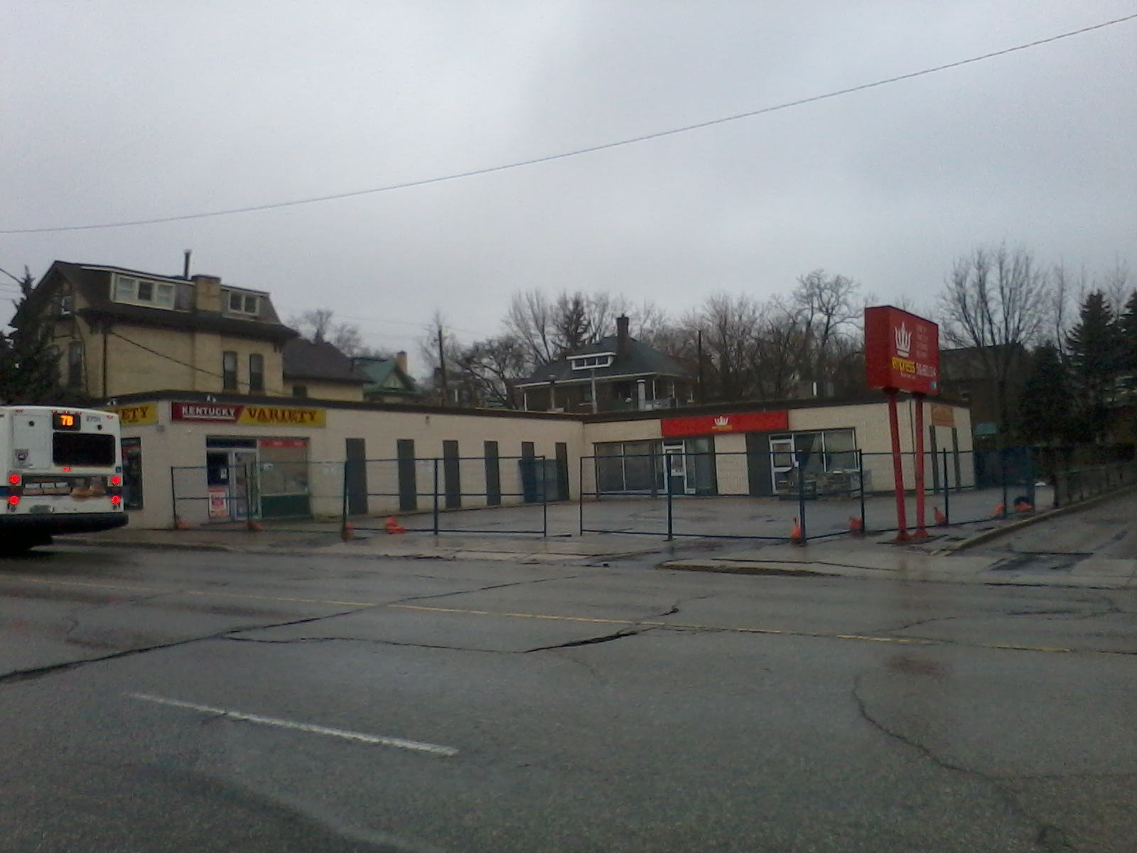 The Empress of India and Kentucky variety store at 101 and 103 King St N in Waterloo both seem to be closed and a demolition/construction fence is up around the perimeter of the lot.