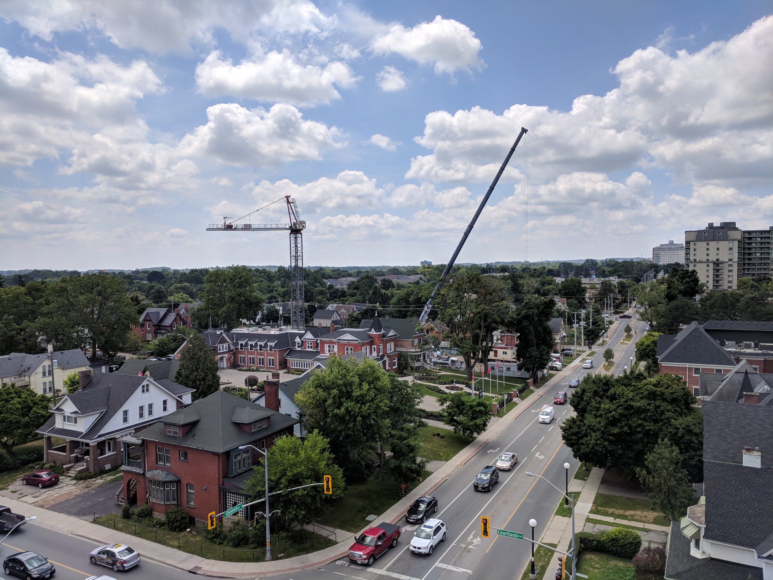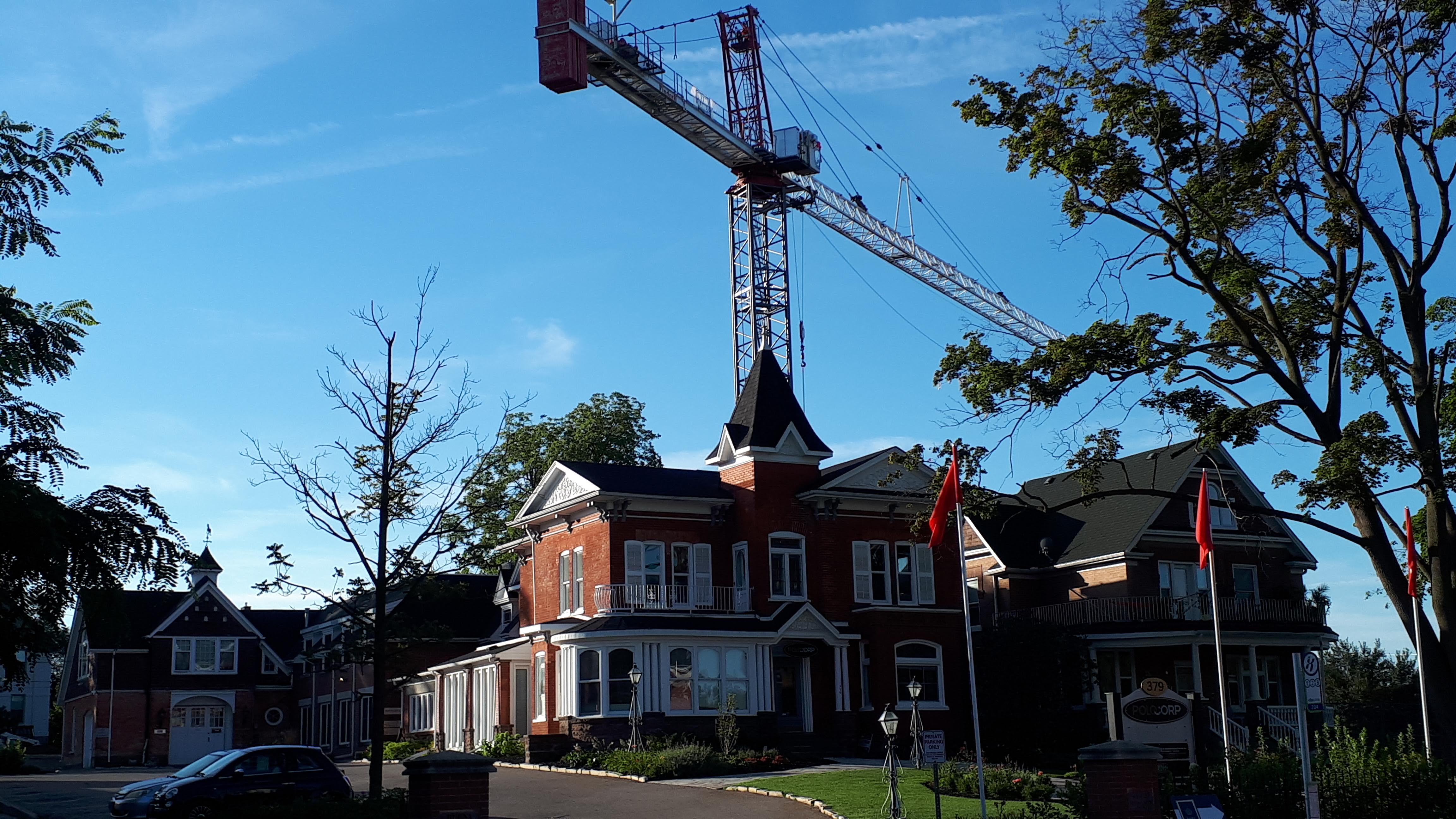 A mobile crane seems unlikely to work given the building design. But I could be wrong ...