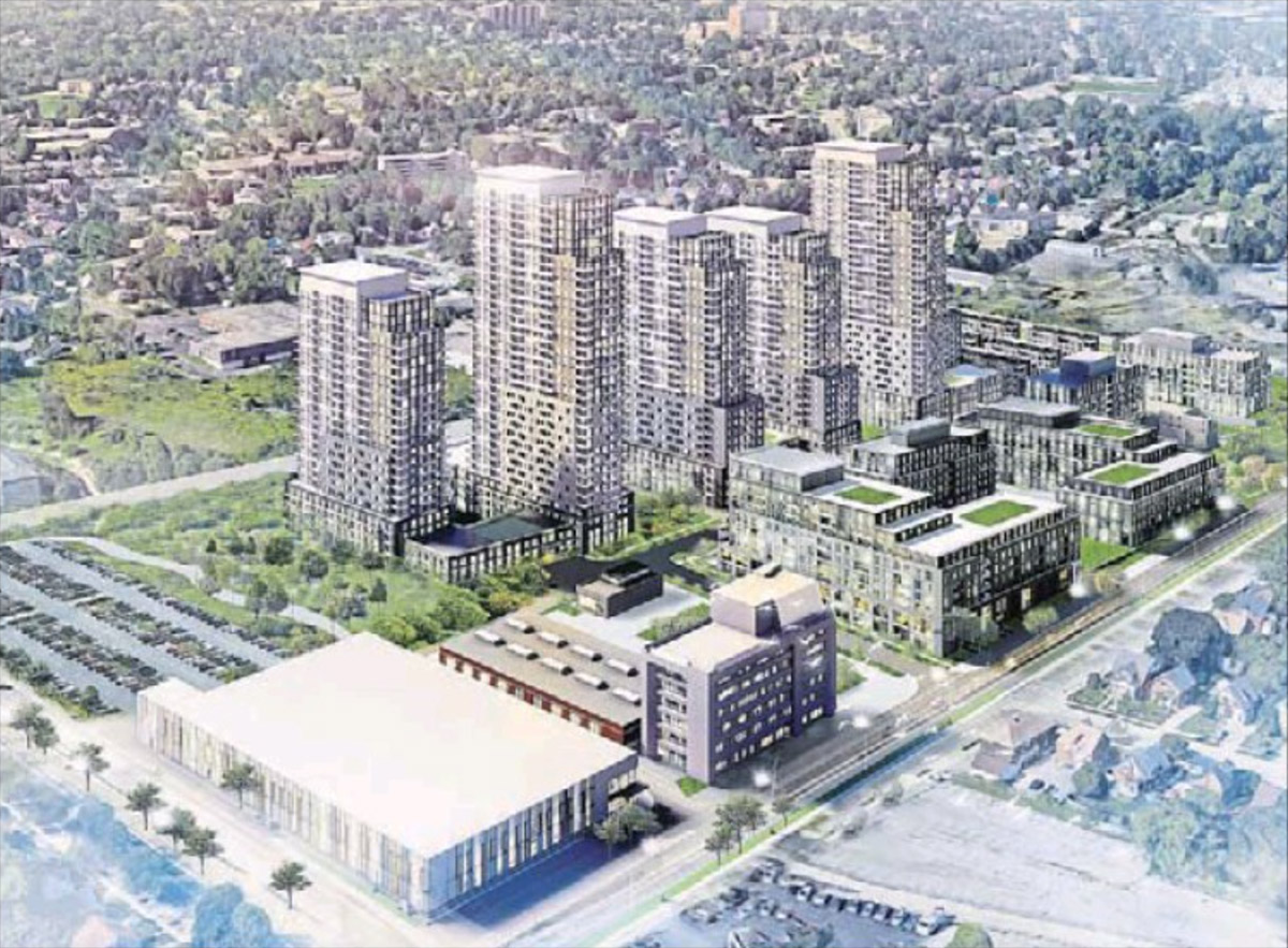 This is the render from the Record. I count five towers, five mid-rise buildings plus some townhouse-looking buildings close to Stirling Ave.
