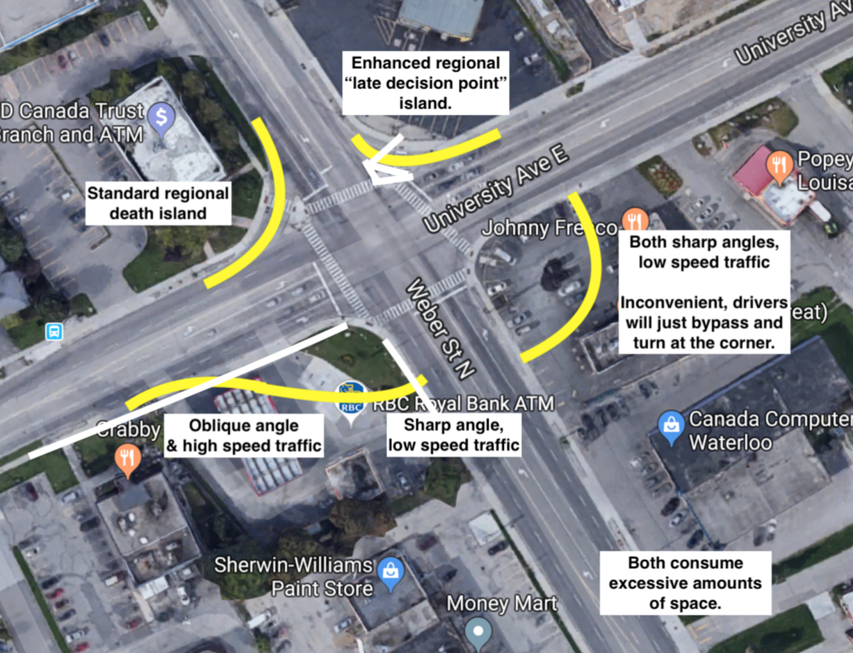The upper left is a traditional regional death island, you'll note it matches exactly the wide and generous turn on actual Weber St. The top right is something new the region is doing, where they change the geometry of the turn to make the decision point much later, in theory drivers are forced to slow down more and make it safer.