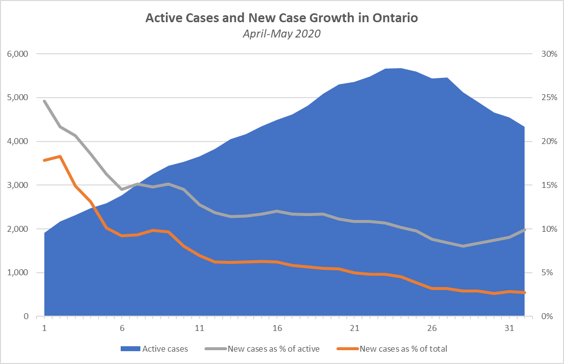 The new-case count ticked back down to 434 in Ontario for a 2.5% increase. 615 recovered and 40 dead for a net reduction of 221 active cases. There are now 4,332 active cases given 12,005 recoveries and 1,216 deaths -- that's looking like it will be a roughly 10% mortality rate among confirmed cases (asymptomatic cases that were never tested would significantly drop that).