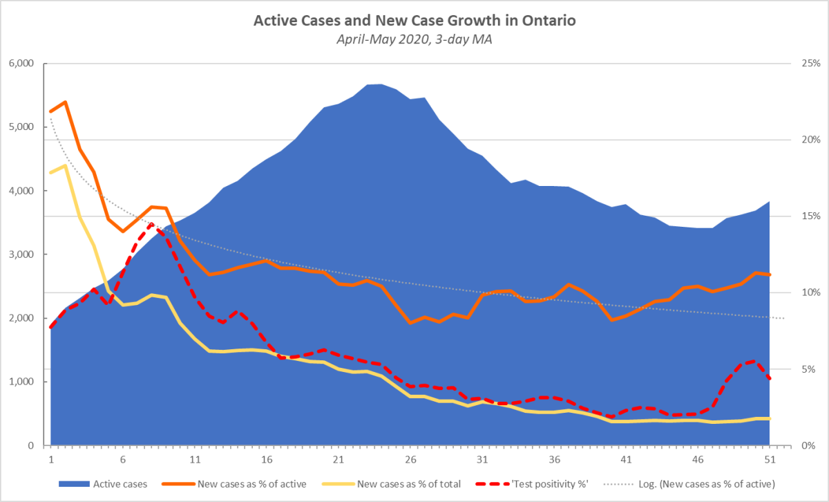 (05-22-2020, 02:15 PM)tomh009 Wrote: OK, I will say first that I am not happy with the current situation. New cases are averaging almost 400 per day. Testing volume is not improving. Active cases are going up. New cases as % of actives are going up. Test positivity % is going up. And yet we are proceeding to increase risk. Sigh.