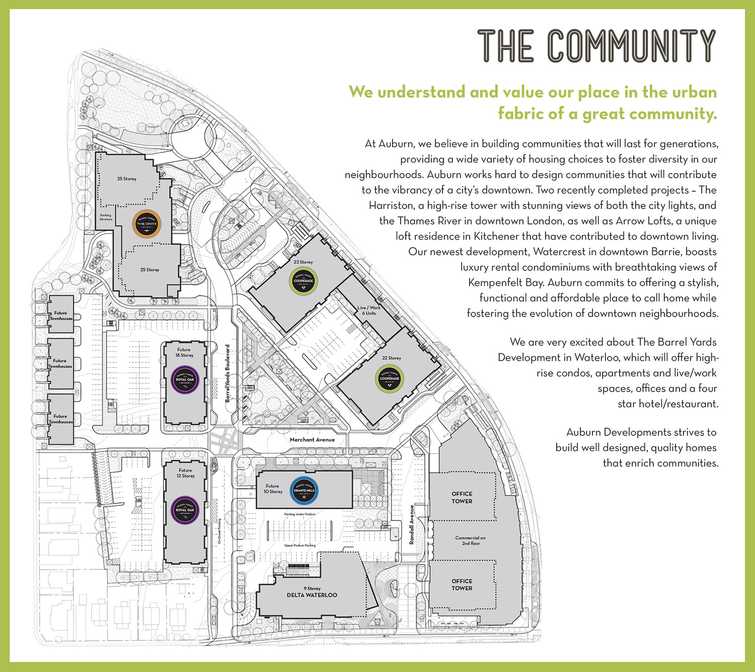 Up to 10 buildings were planned for the site, including condominium, apartment and office buildings. Building heights range up to 25 storeys.
